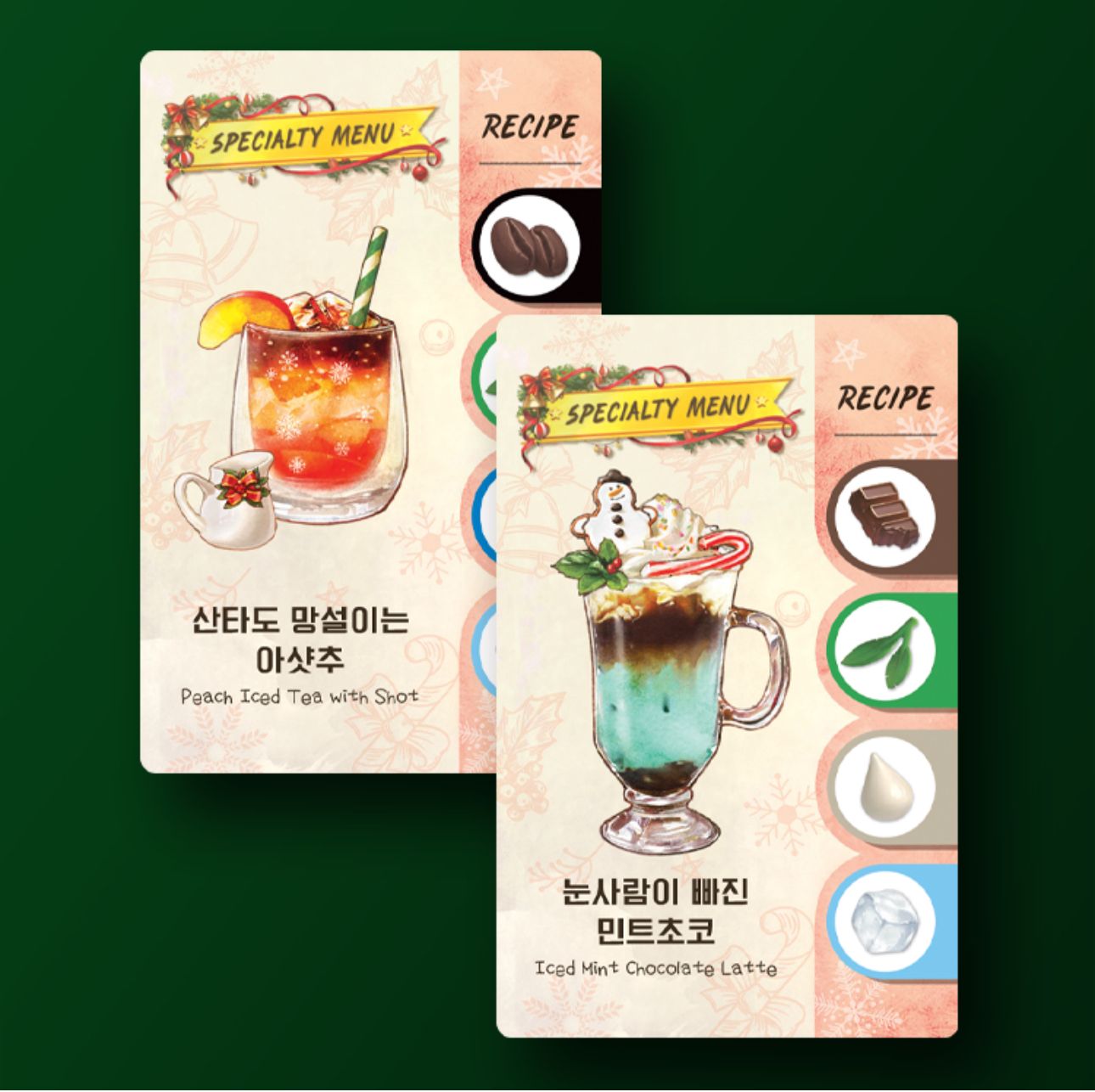 Descrizione: Two promo cards for 2024 Christmas. Peach iced tea with shot, iced mint chocolate latte.