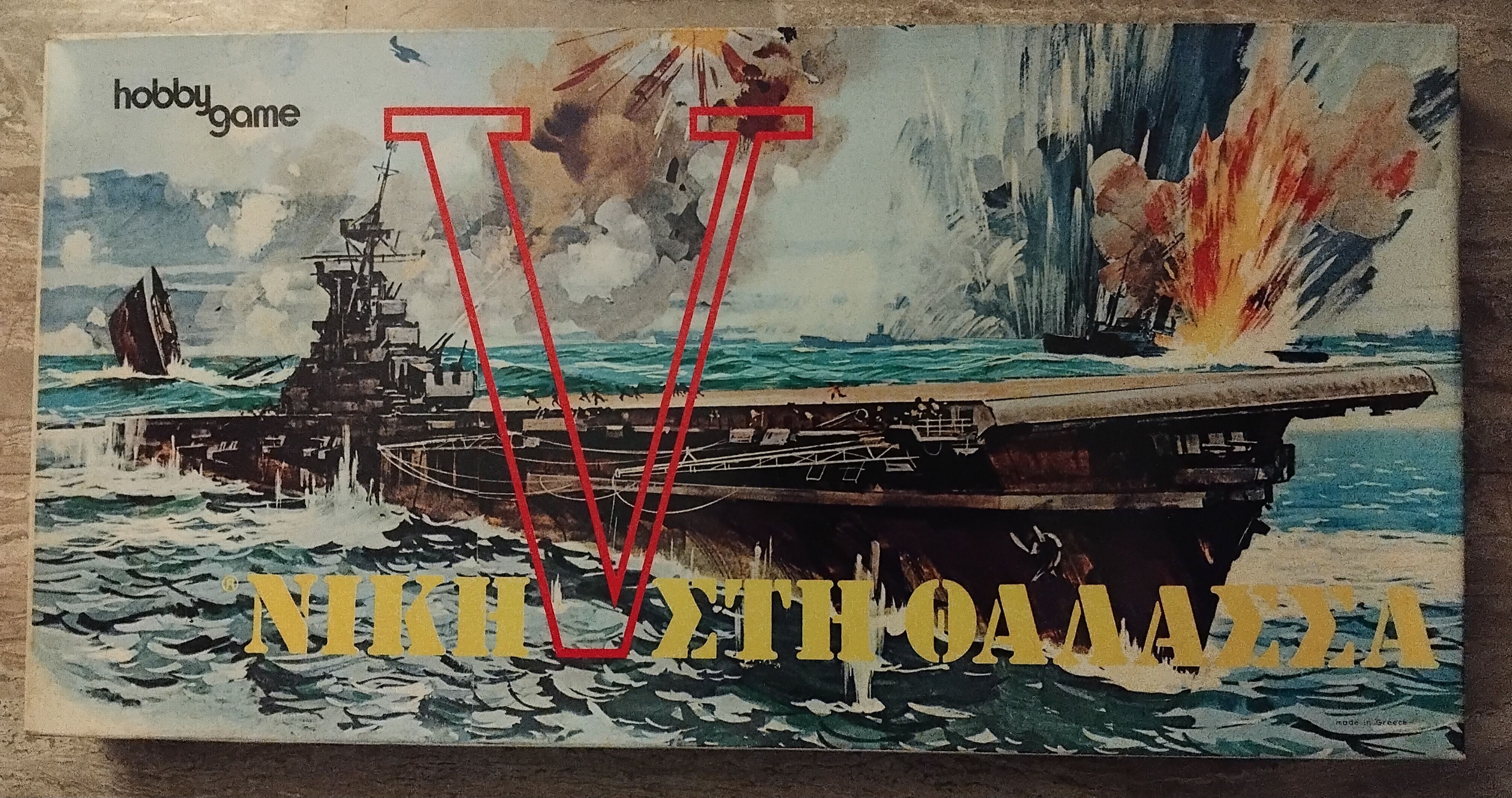 Descrizione: A board game for two players manufactured and released in Greece from Hobby Game in the 70s. Each of the two players has 7 ships of different types (flagship, submarine, etc.) and starts from their own port. The movement is determined by the spinner (forward, backward, fire). With "fire", a player can sink enemy ships, depending on the type of ship that is acting.