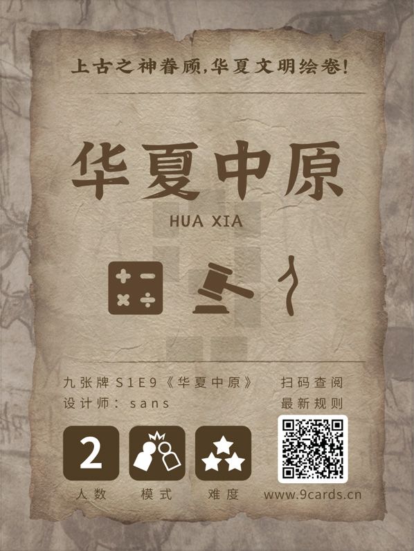 华夏中原 (Hua Xia) is a 2-player Euro-style game that centers on auctions. In each round, players use expansion points during the Expansion Phase to compete for resources, and then utilize those resources in the Production Phase to develop agriculture, military strength, or perform divine rituals. Players can achieve victory either by gaining military or divine supremacy or, after five rounds, by scoring the highest total through overall development.