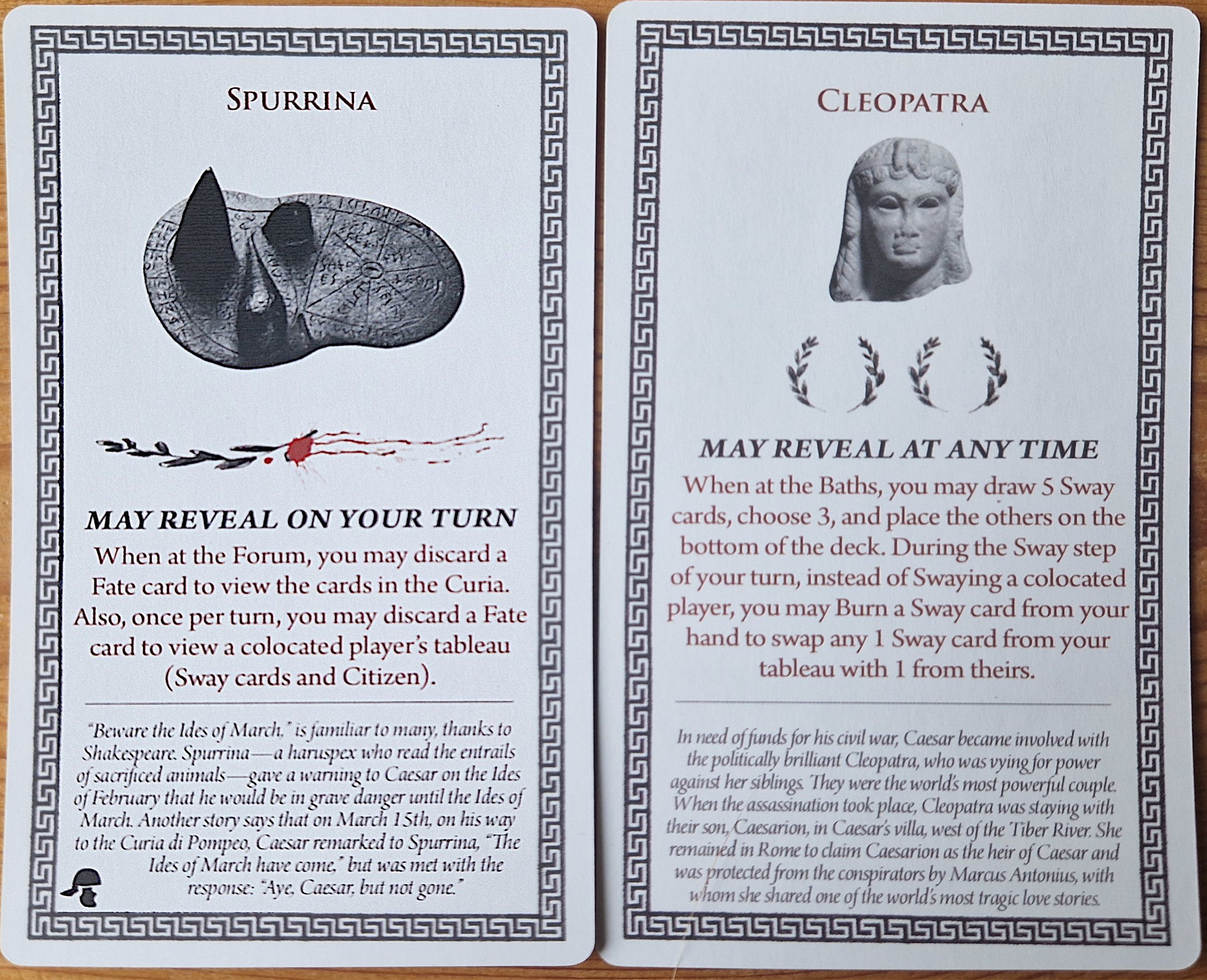 When at the forum, you may discard a fate card to view the cards in the Curia. Also, once per turn, you may discard a fate card to view a colocated player's tableau (sway cards and citizen).