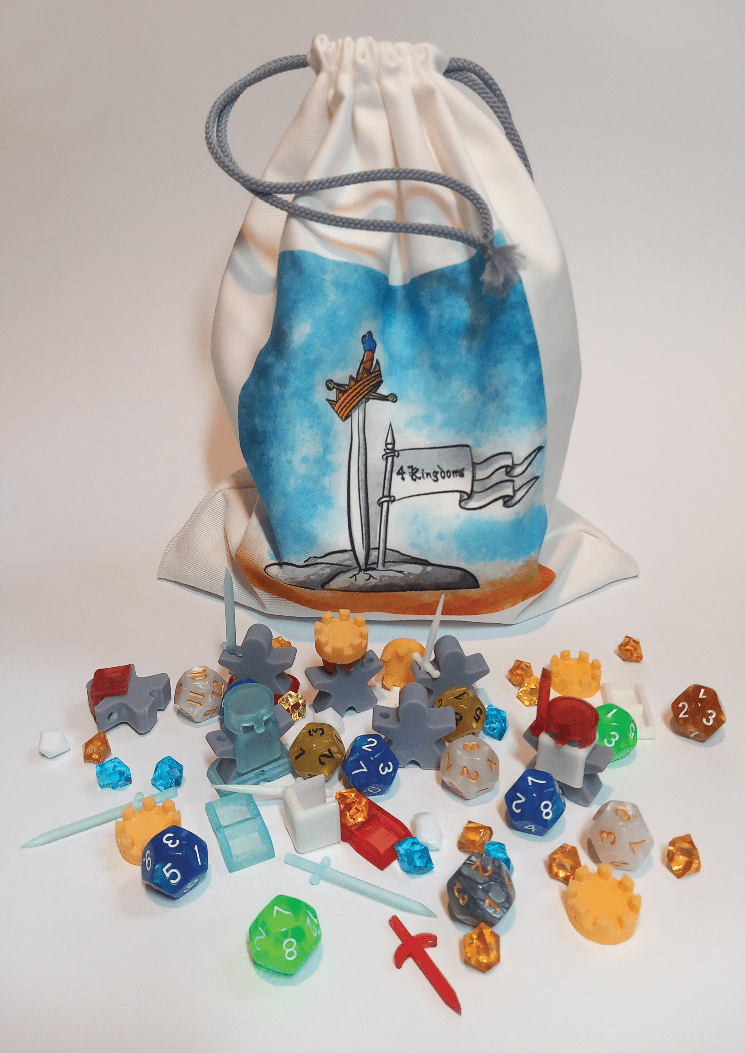 Descrizione: 4 Kingdoms is a 2-4 dice rolling army building strategy game, where you use dice a gather resources so you can buy more dice but ultimately build the strongest army with physical bits and then do glorious battle to win the most crown and become the next king or queen.