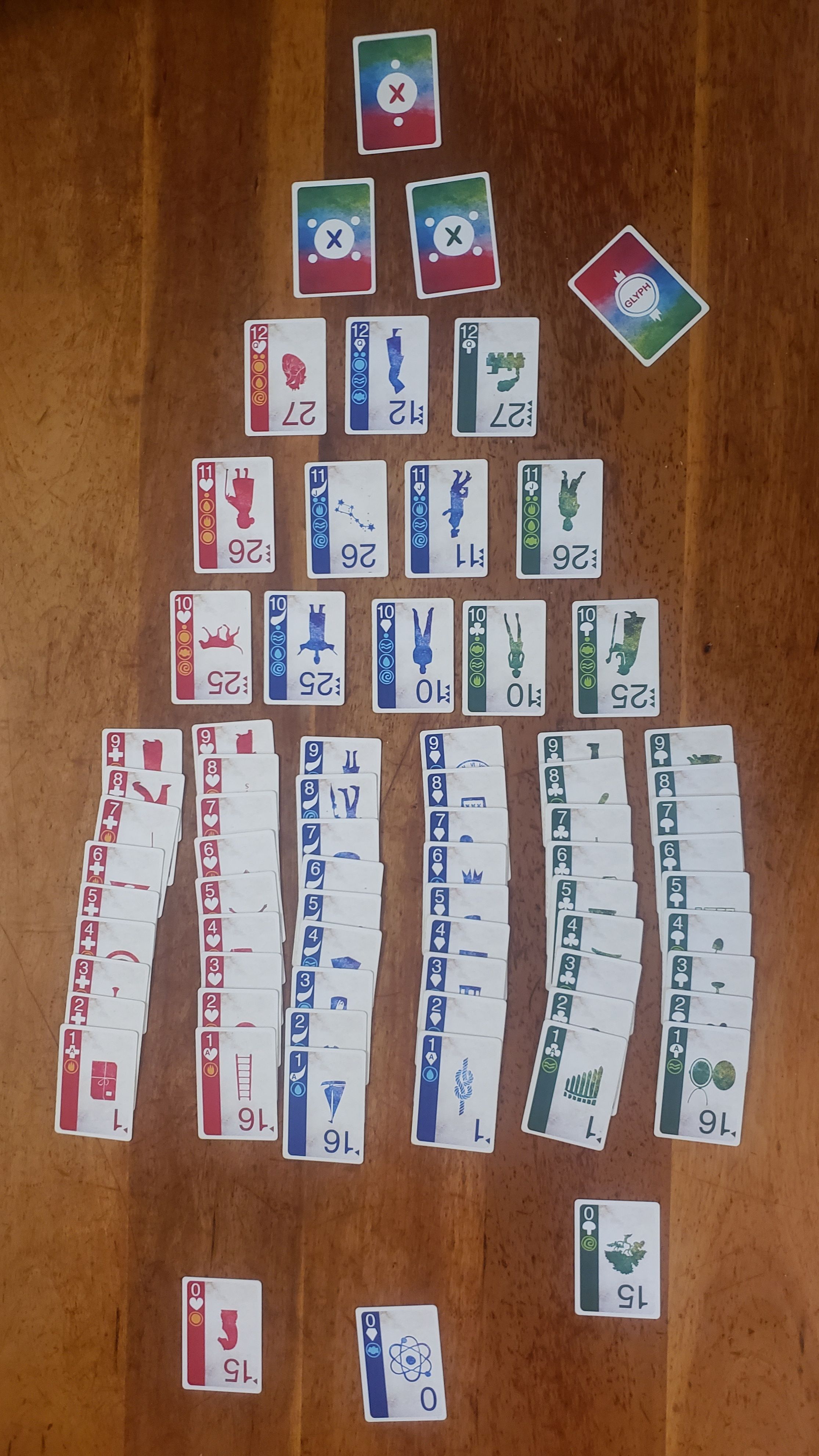 The deck has three colors with six of each rank up to 9; rank 10 only has five cards, rank 11 only has four, etc, until the single high card (the dragon) is reached.