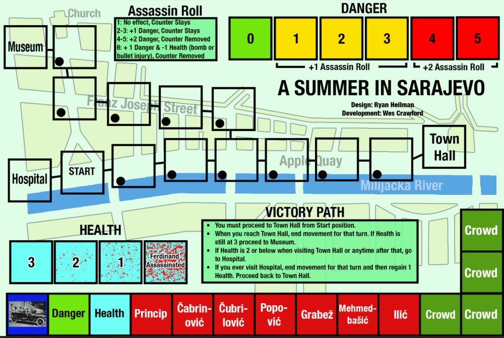 Descrizione: A Summer in Sarajevo is a tense, postcard-sized solitaire game where you guide Archduke Franz Ferdinand’s motorcade through the streets of Sarajevo on the fateful day of his assassination. As you navigate a map filled with hidden counters - some representing crowds, others deadly assassins - you must make strategic movement choices that affect your danger level and health. Each encounter with an assassin triggers a die roll that can escalate the threat or cause injury. Your goal is to reach the Museum safely, managing risk and responding to injuries along the way. With simple mechanics and historical flavor, this compact game delivers suspenseful decision-making in under 10 minutes. —description from the publisher