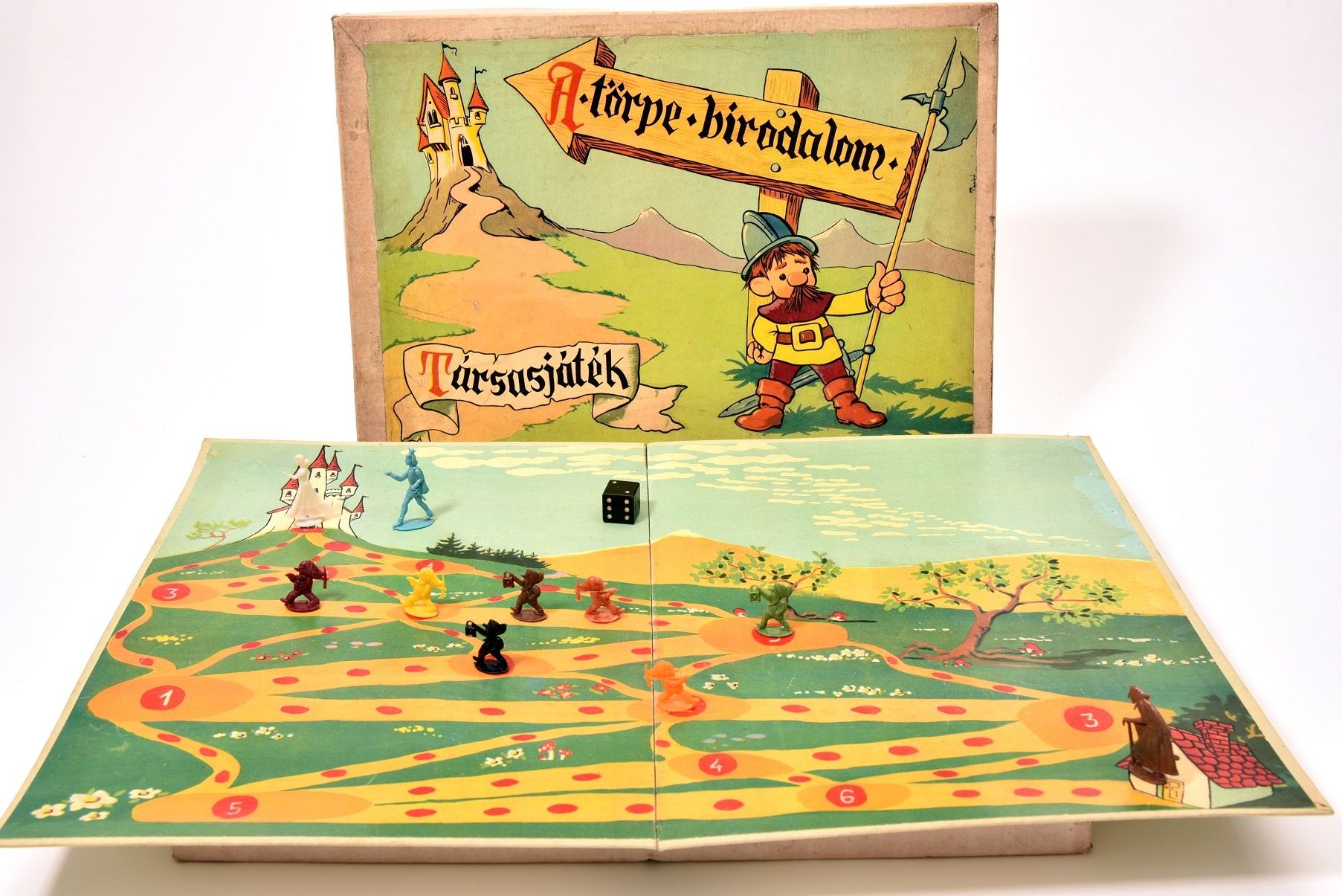 A törpe birodalom társasjáték. Játékszabály a doboztetőben. Tartozékok: játékmező, fekete dobókocka, 10 db figura (királylány, királyfi, boszorkány és 7 db törpe csákánnyal, lámpással)." -