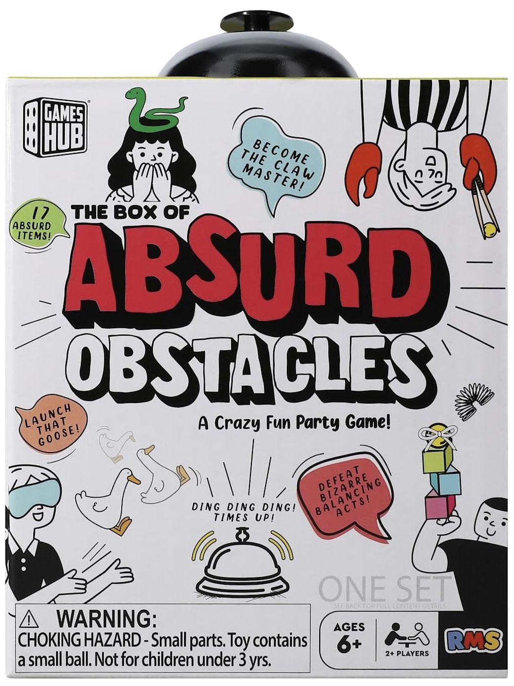 2.) Try to complete the absurd obstacle before the ding! ding! ding! Times up! Each player tries to complete one obstacle challenge each round. Alternate one player each round who’s not completing the challenge to be in change of the timer and the bell.