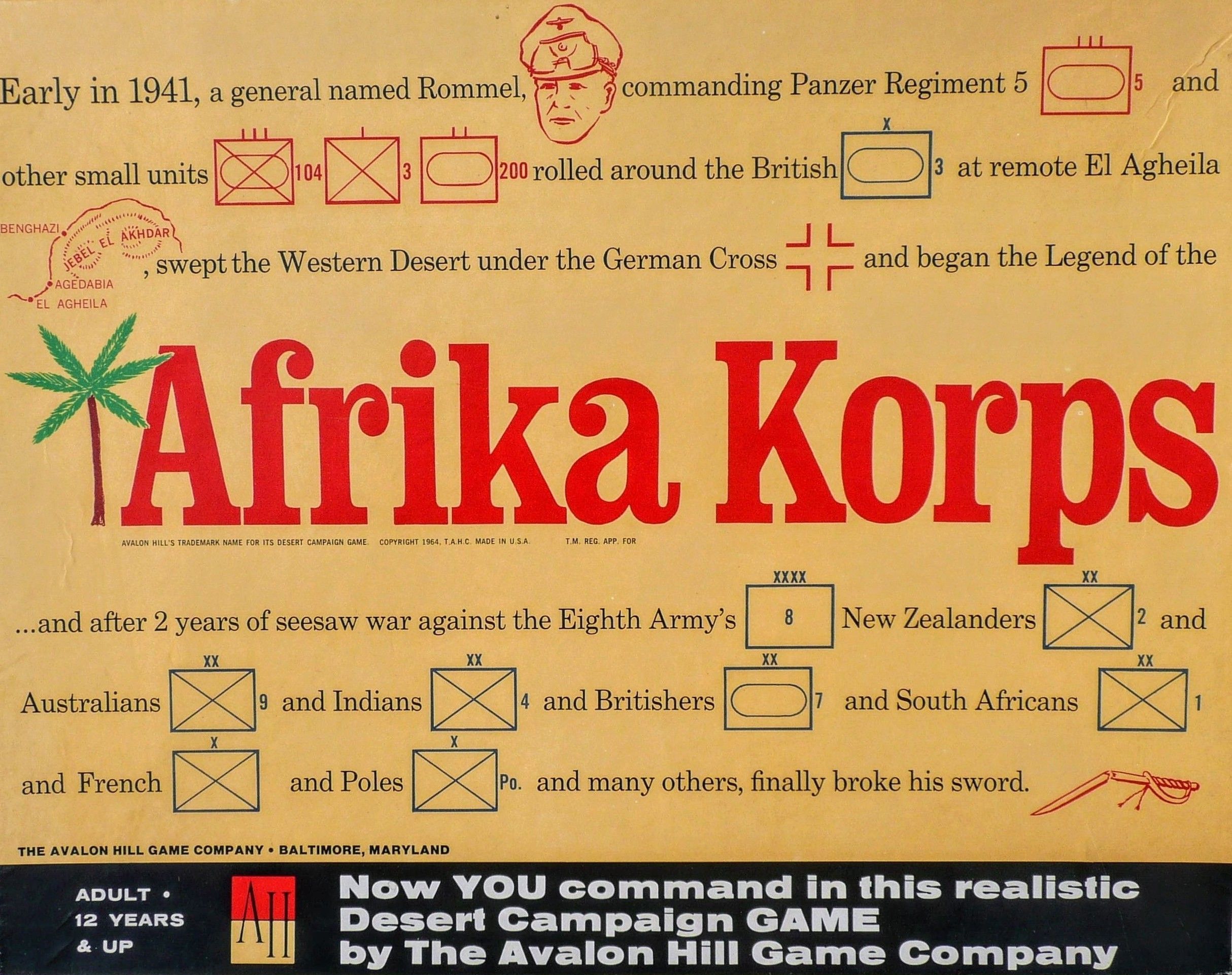 Now, the legend of "The Desert Fox" is recreated. From April 1941 through the climatic battle at El Alamein in later 1942. Afrika Korps simulates the mobile conflict between Rommel's Panzerarmee Afrika and the British Eighth Army defending Egypt and the Suez Canal. During each monthly game-turn, the initiative may switch from the Germany to the Allied player as both come to understand why Rommel called North Africa "A tactician's paradise; a logistical officer's nightmare."