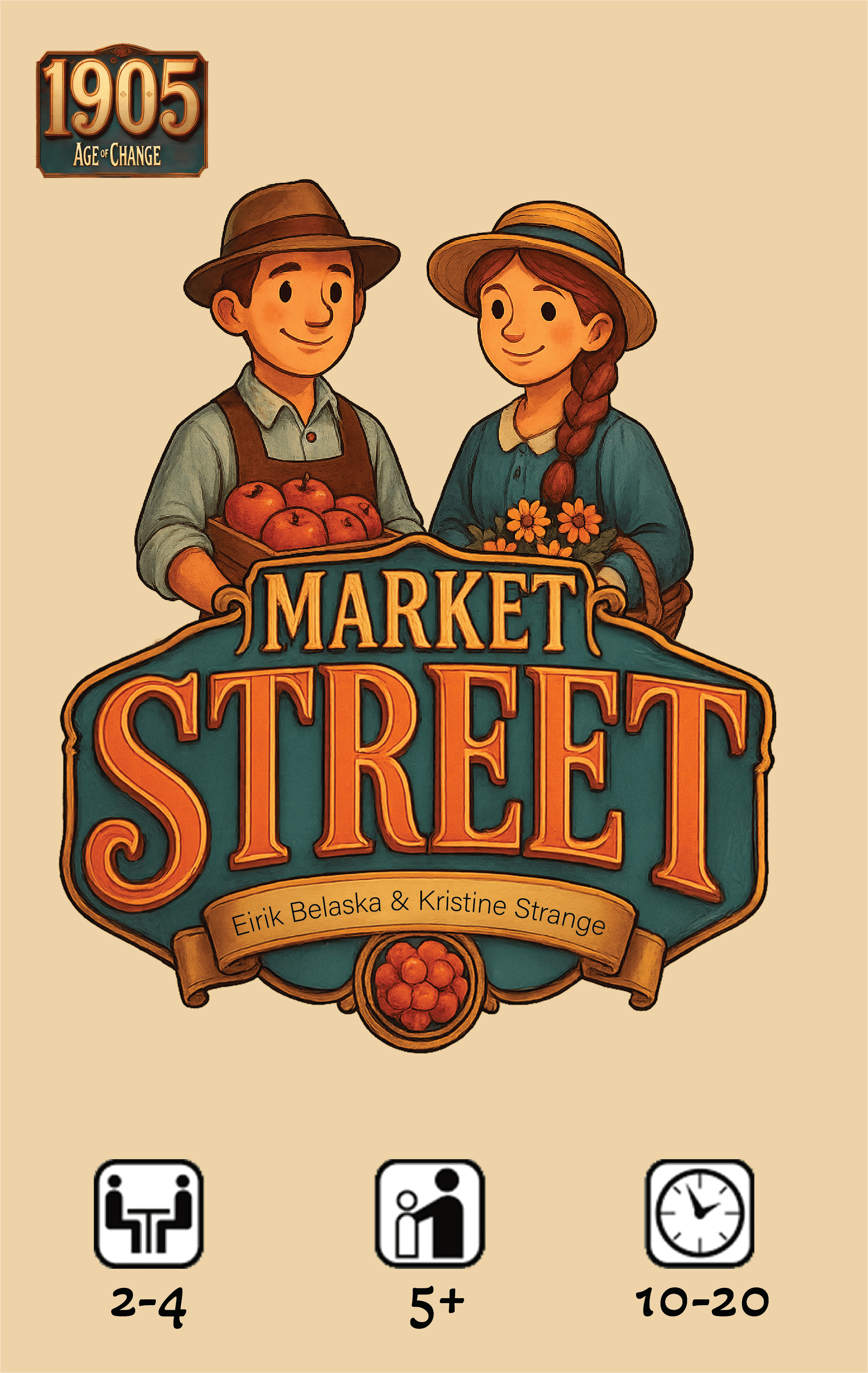 Descrizione: Step into the bustling marketplace at the turn of the century, where clever trading and sharp bidding will decide who becomes the wealthiest merchant in town! In Market Street, 2–4 players compete to fulfill customer orders by collecting the right goods through lively auctions and cunning hand management. Every round, players bid their limited coins on goods and powerful special cards, trying to outwit their opponents and secure the most lucrative deliveries. Delivering goods to customers earns you valuable customer cards, each granting one or two gold stars (victory points). Special cards let you manipulate the market, steal goods, or refresh the customer row, creating exciting twists and strategic opportunities. The game ends when the agreed number of customer cards has been fulfilled. The player with the most gold stars on their collected customers wins. In case of a tie, the player with the most cards left in hand is declared the winner. —description from the designer