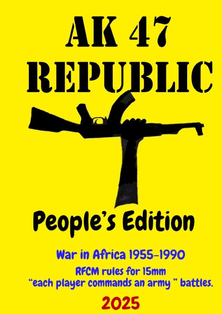 Descrizione: Period of Warfare covered War in Africa 1955 to 1990. Peter Pig games always cover a narrow period in order to capture that period. Thus the most important aspects of that war can be modelled and the less important ones piled into the general mechanisms. Scale Each square = 120 metres. Each model figure represents 6 real soldiers. Each model vehicle represents 3 real vehicles. Game setting Army versus army defence/attack games. Associated Peter Pig range Range 17 Range 17- AK 47 republic. The PP WW2 range has suitable items too Peter Pig always makes sure that the necessary stuff to play the game is available. Game scenario generator Players share 36 D6 into 5 scenario categories (no you don’t need 36 D6). For each category players roll against each other and one player wins the category by 1,2,3 or 4. This will generate 1,2,3,4 tokens Leader (extra action points tokens) , Men (extra ability to assault tokens), Equipment (Better hits tokens), Cause (better morale tokens), Random (various, including minefield, sirocco, bush fire) . Player with higher token total will choose who attacks/defends. —description from the publisher