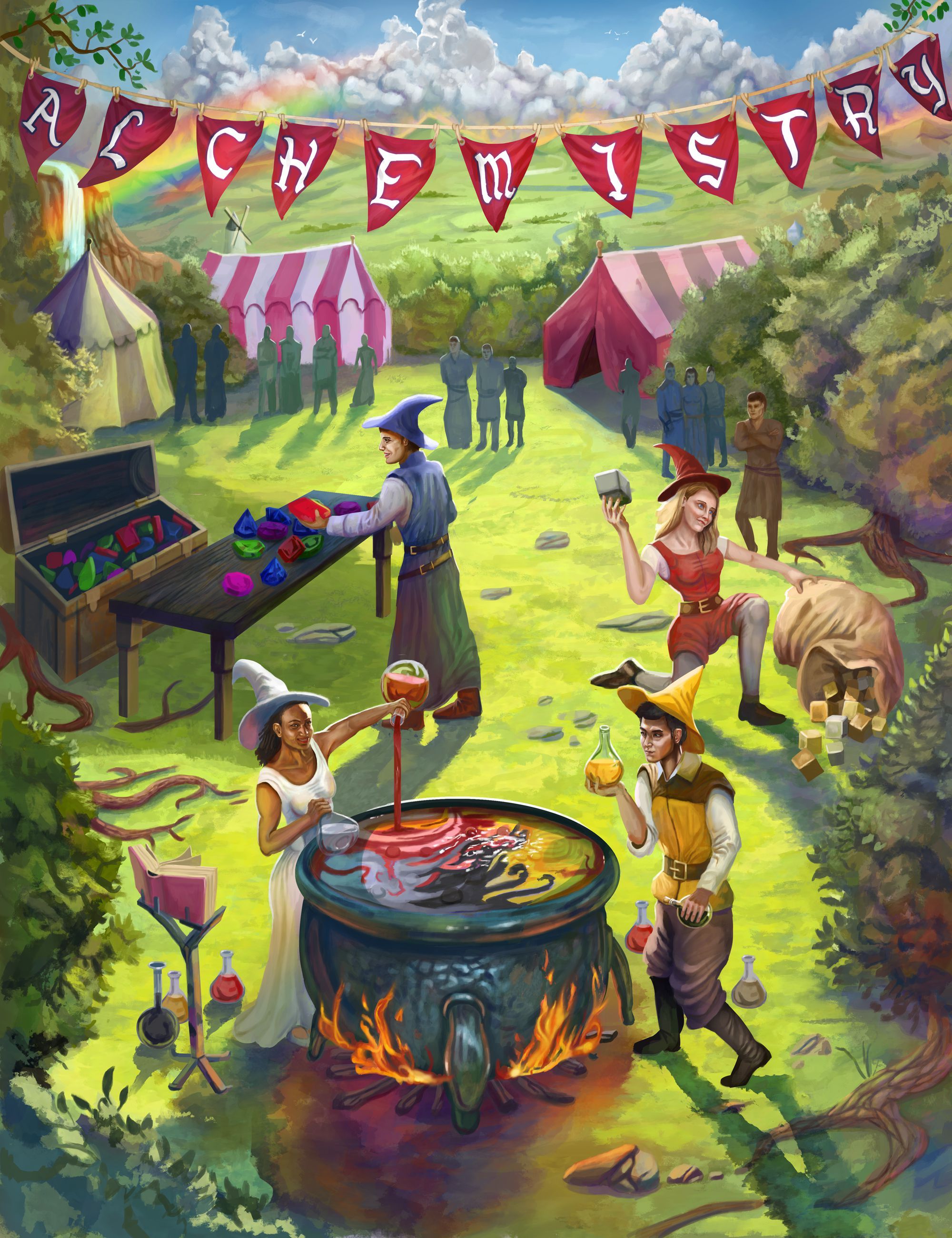 Alchemistry is based on a medieval setting in which players compete in an alchemy fair to brew various potions by mixing different ingredients and combining formulas. The game uses a tile-placement mechanism to create different potion compositions and create player interaction. Players can also decide to transmute their resources into rare ingredients or to engage trading in gems to pursue points on various tracks.