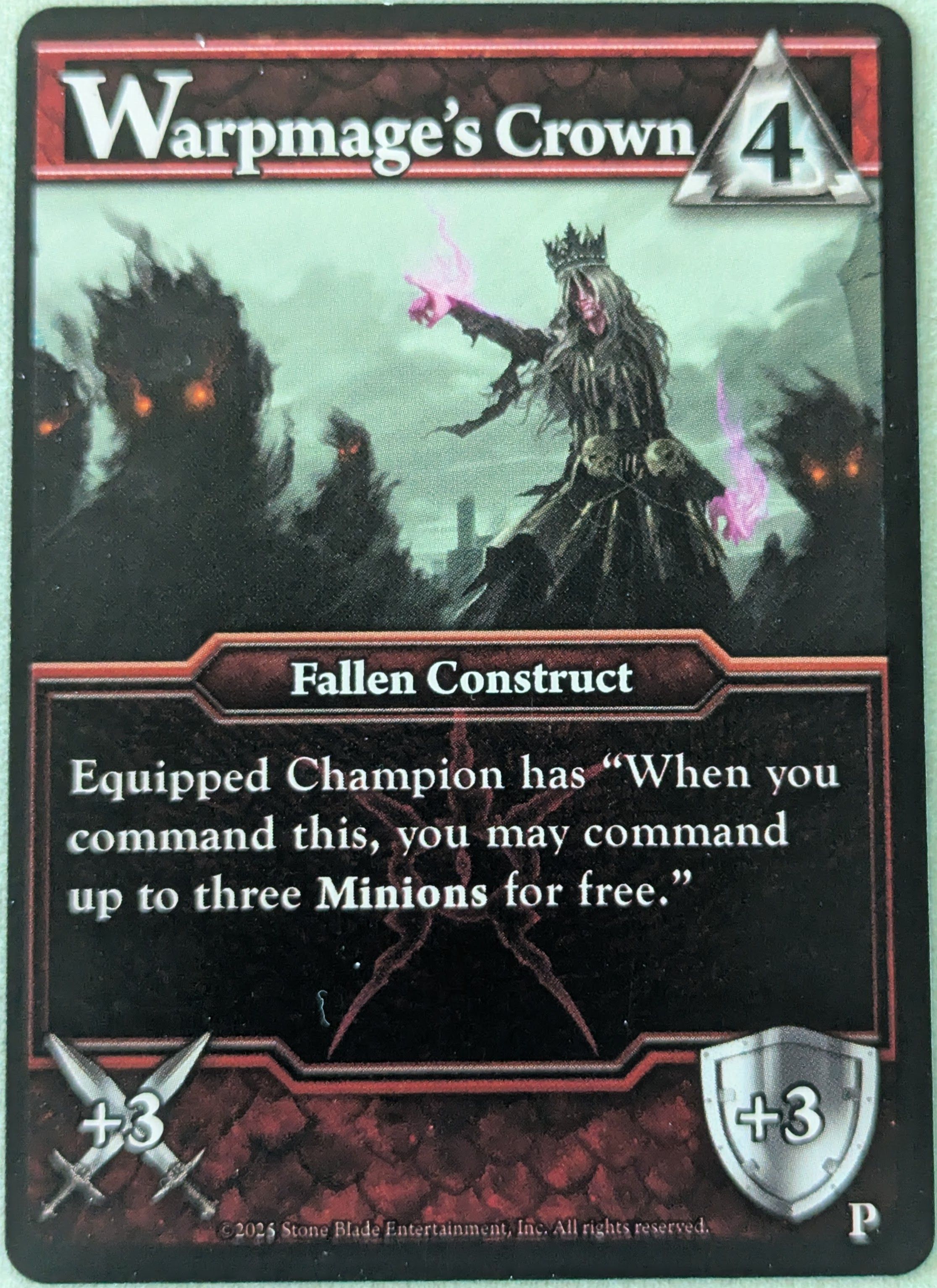 Descrizione: Originally available at GenCon 2025. Name: Warpmage's Crown Cost: 4 Runes Type: Fallen Construct Effect: Equipped Champion has "When you command this, you may command up to three Minions for free." Bonuses: +3 Strength, +3 Defense