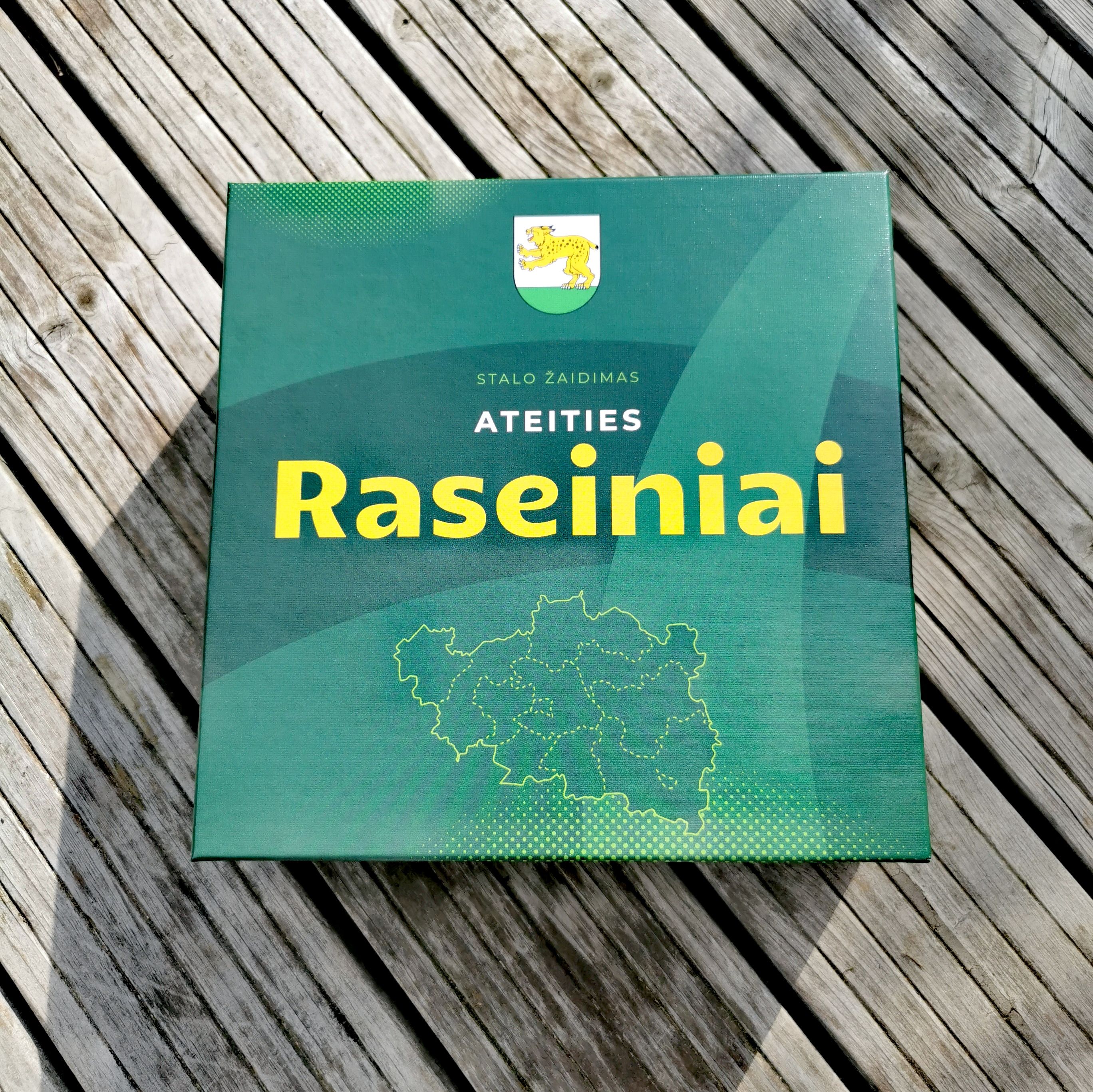 Descrizione: Board game dedicated to a small Raseiniai town in the central part of Lithuania. It is a dice rolling and track moving game. Players move their pawns, buy and expand variety of crucial business activities and services to develop best town in region. From building industry to biotechnologies, robotics and farming, everything is fitting in the modern city. Travel through local nature and historical monuments, trade in the stock market, bet at the local horse race and invest in the city infrastructure. If you are out of money, take the loan from the bank or travel the inner income circle to provide extra services in surrounding smaller municipalities. Game ends as soon as the last business piece is sold, players get winning points for each ownership of the companies, business combos gives extra points, also players get points for each visited local monument, investments in to the city infrastructure, shares and money they still have in their hands, there some end game penalties if players didn't returned all loans to the bank.