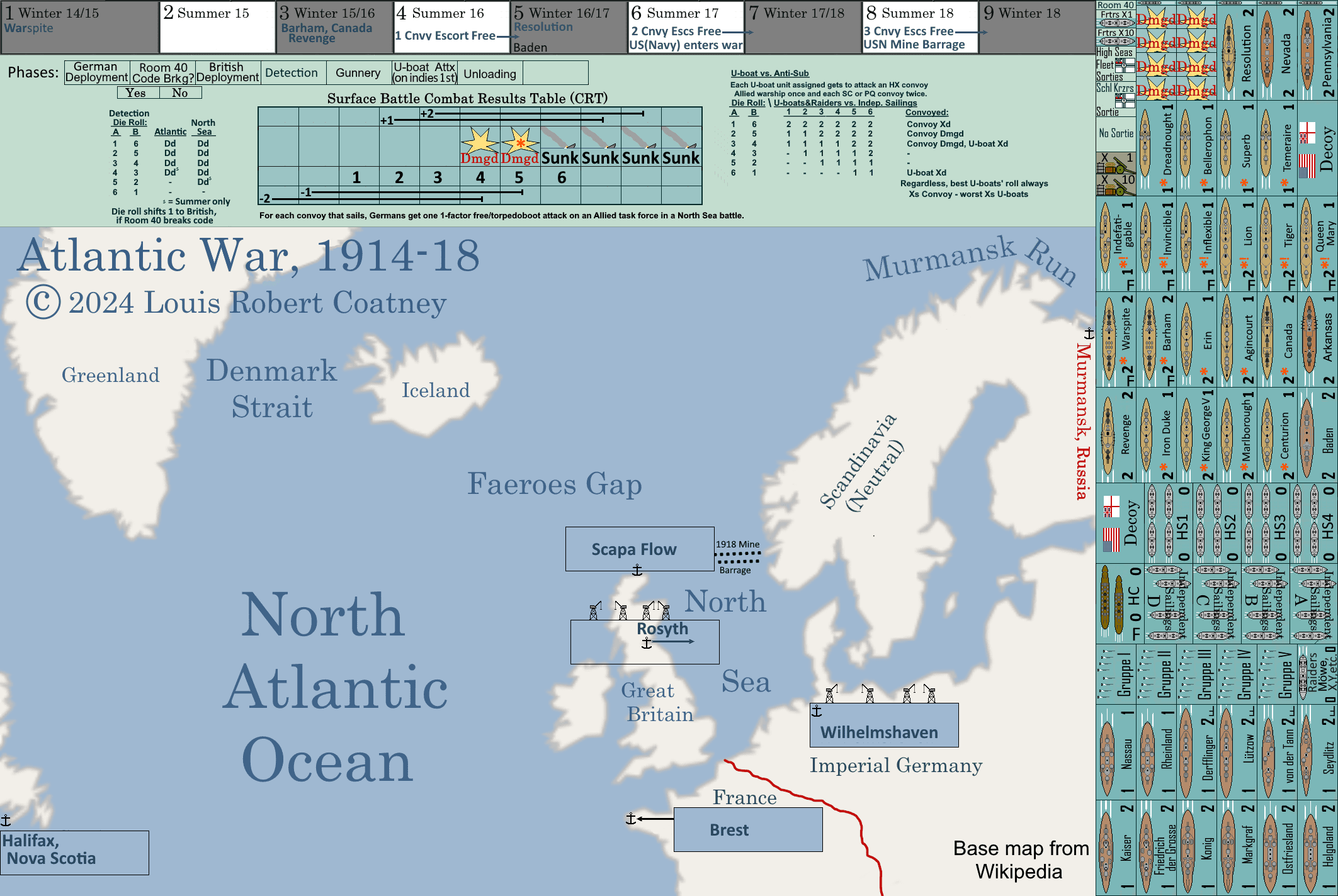 Trying to keep the German High Seas Fleet bottled up in the North Sea (which has a blown up chart for fleet battles) is a game in itself, albeit helped by Room 40 codebreaking.
