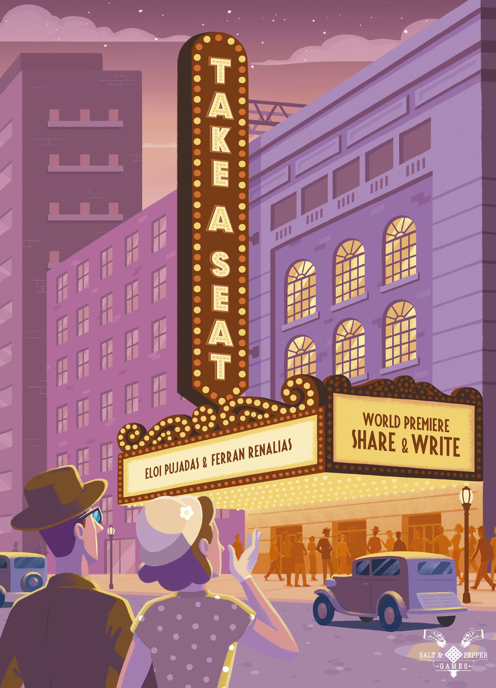 Take a Seat introduces an innovative mechanic named Share & Write where the randomness is created by player interaction (instead of a dice or a card). In each turn players will get a reservation panel and they will have to decide whether to use the usher's ability or get direct points. Then they will need to mark a reservation in the board of their right or left (depending the turn) by scratching on any of the 4 tickets of the reservation panel. Finally they will have to assign seats on the theater by marking the outline and the circles that correspond to the selected pieces in the previous step.