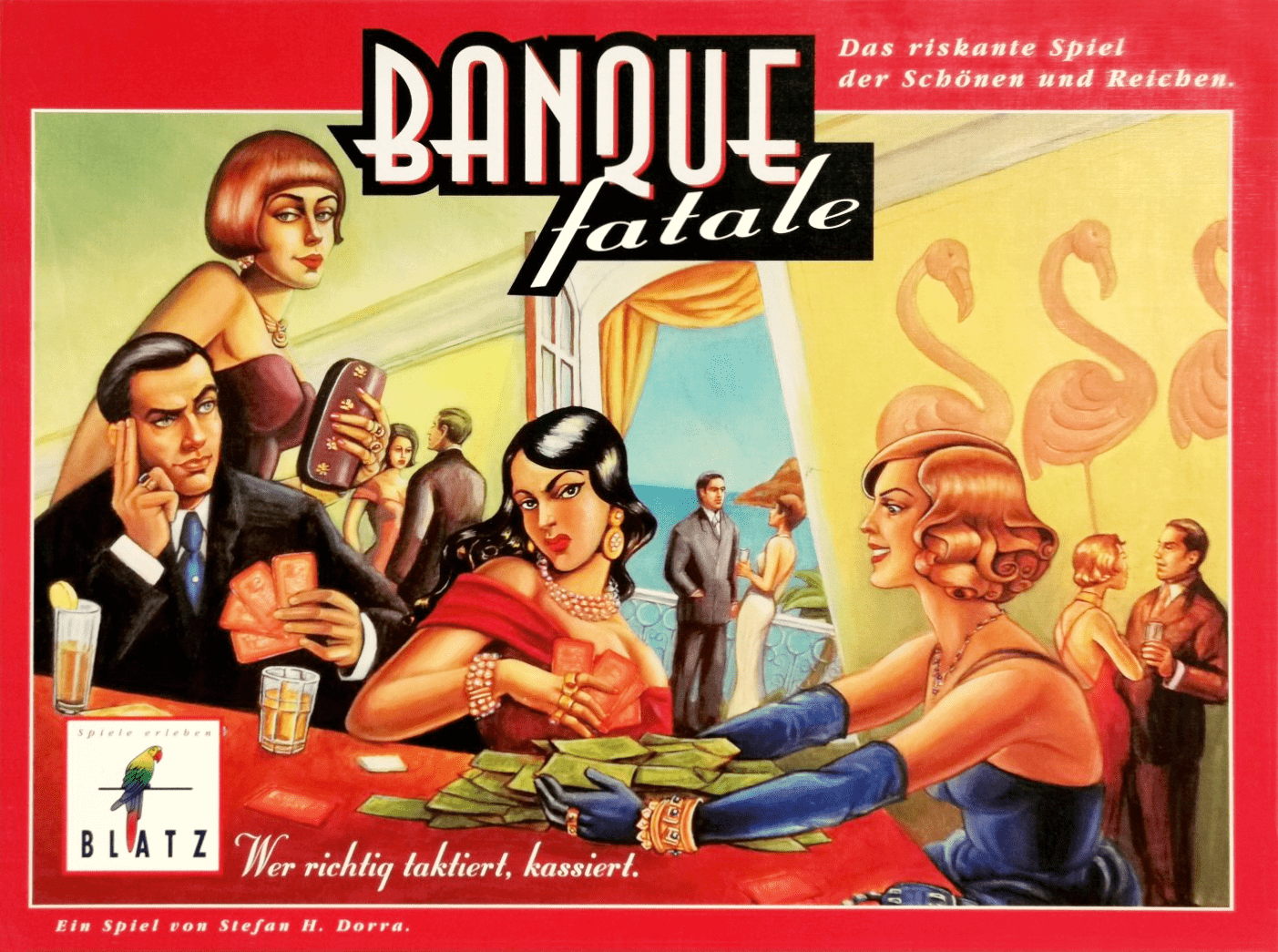 Descrizione: In Banque Fatale, players bid with colored chips for cards (called Card Fatales) which show an Ace or Aces in the 5 colors. The value of the colors start at 6 million and rise and fall according to the total chips played. So if 2+ Blue chips are bid, Blue rises by 2 million. But if only one Blue chip was bid, Blue falls by 1 million and if no Blue chips were bid, Blue falls by 2 million. If a color reaches 11 or 12, there is a pay-out for each Ace of that color you own, 5 or 6 million, and it is reset to 6 million.