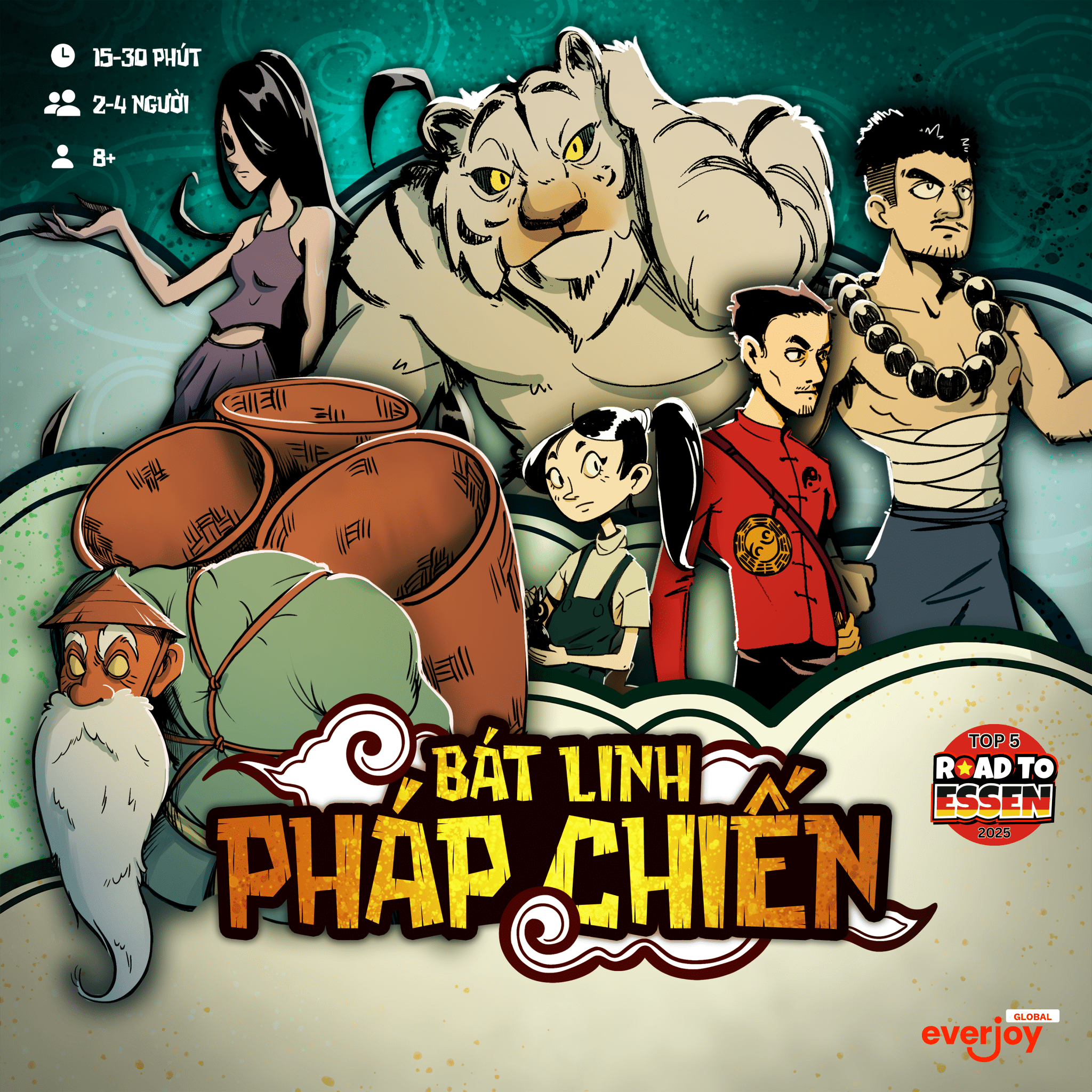 Descrizione: Bat Linh Phap Chien is a competitive 2-4 player duel set in a world of Vietnamese spiritual legends. Players take on the roles of mythical characters in a tense showdown to be the last one alive. On your turn, you spend 5 Action Points to play cards for attacking, defending, or drawing more cards. The core strategy is positional: to attack an opponent's specific zone, you must play your card in the corresponding zone on your own board. The last player remaining on the board is the winner. —description from the publisher