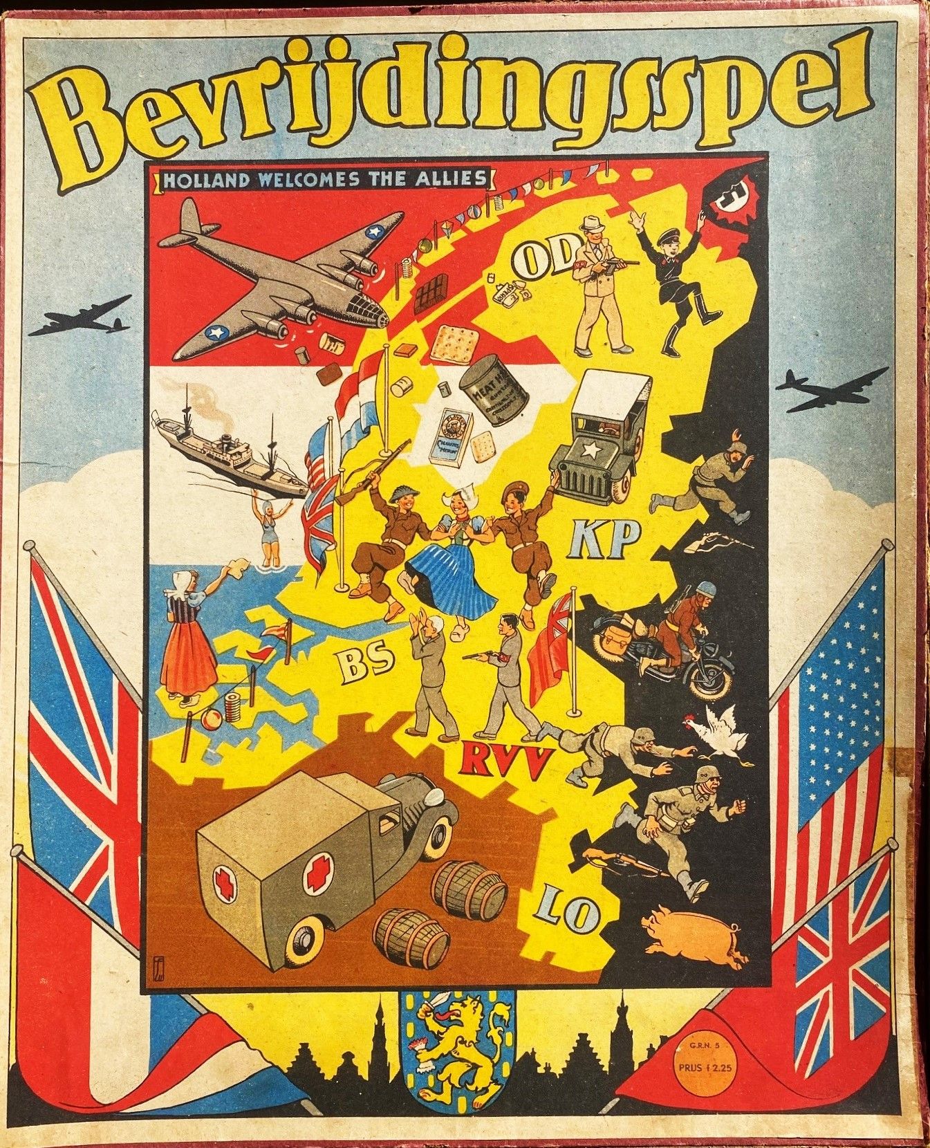 Descrizione: Bevrijdingsspel ("Liberation Game") appears to be a relatively scarce WWII Dutch game celebrating the liberation of the Netherlands by the Allies from Nazi Germany.