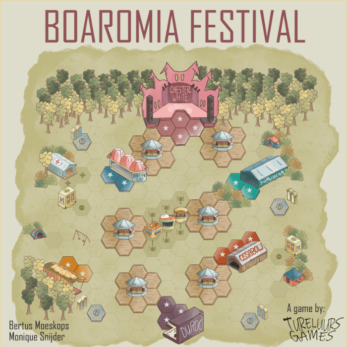 Descrizione: Ever tried organizing a group photo at a festival? With six people, two dead phones, one who's at the loo, and someone who’s definitely not okay? That’s Boaromia Festival. A co-op board game where you and your friends try to survive the most gloriously chaotic festival ever created, without leaving your house, or needing a tetanus shot. In Boaromia Festival, you’ll chase your favorite artists, dodge an old acquaintance, hit the food court like it’s a quest, forget to pee, and probably end up at the first aid because you forgot to eat. It’s messy, it’s loud, and just like a real festival, you’ll probably forget half of it but tell the stories forever. Your mission? Simple, in theory, hard in execution: Get the whole crew together at the right stage, at the right time, with enough joy in your souls to snap that iconic group photo. The game is played in 12 rounds At the start of each round, draw an event card and resolve it. Players take turns (in any order, plan together) and can move up to 6 steps, taking actions along the way or at your destination. At the end of a round: all players lower their energy by 1, move the line-up token forward. At round 7, night begins: replace day goals with night goals, from now on only draw night events. Players win by snapping a group photo when all players are at the same stage while an artist is performing and everyone has an 8+ fun level. —description from the publisher