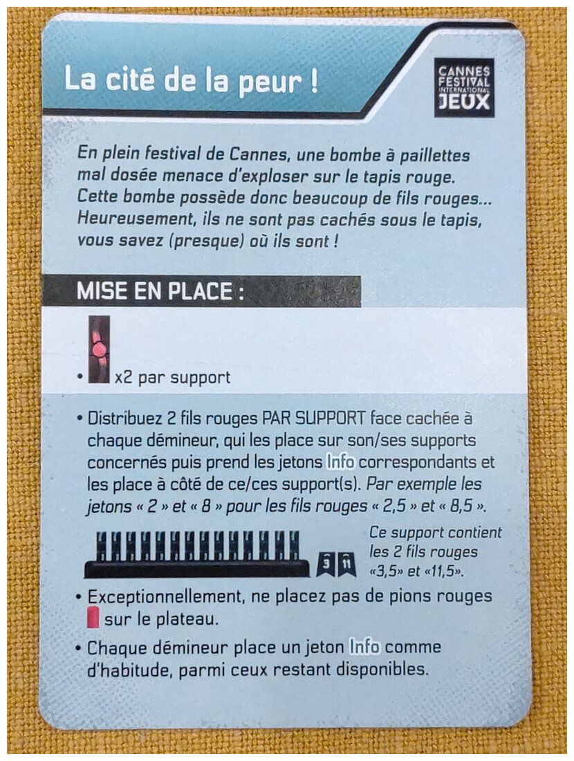 Descrizione: Promo card given at the 2024 Cannes Board games Convention (FIJ) a mission titled "La cité de la peur" in french, "The City of Fear" in English (reference to a French second-class horror movie has to be shown at Cannes Film Festival called "La cité de la peur".