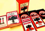 Descrizione: BOOM is a retro ’50s - early ’60s, Politically Incorrect, Insensitive, Irreverent, Totally Outrageous, Obnoxious, Nostalgic, tongue-in-cheek, "Beer and Pretzels," "Gotcha!" Atomic War Card Game for 2 - 8 players. It takes about 30 minutes to play. While deceptively easy, quick, and fun to play, BOOM is a biting satire of one of our biggest fears. Although an anti-war game, BOOM recaptures the Espionage, Propaganda, Pacifist versus Hawk Ideologies, rumors of a Doomsday Machine, Assassinations, and many other Cold War Atomic Age tactics in a nostalgic, darkly humorous, but also very deadly way. The game's winner is often a loser, thus proving that war — especially one involving Weapons of Mass Destruction — is not very nice! Even the buck-tooth cow, standing alone in an empty field, a zero-value City Card that has just been BOOMed, agrees with that! Moof! —description from the designer