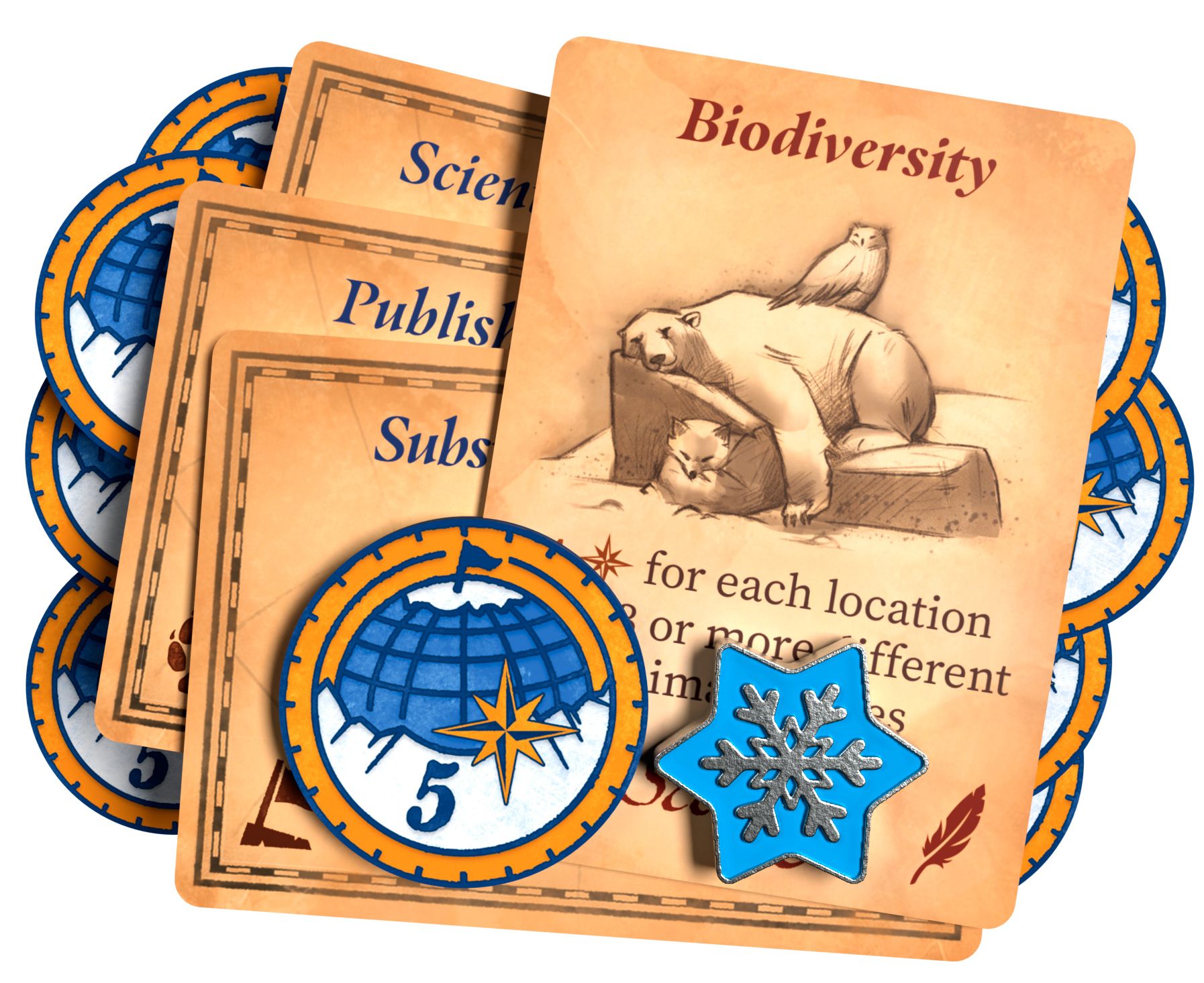 Descrizione: A bundle of 3 additional scoring objectives, a new end-game scoring card, plus upgraded deluxe components - a metal first player token and 12 plastic society crests.