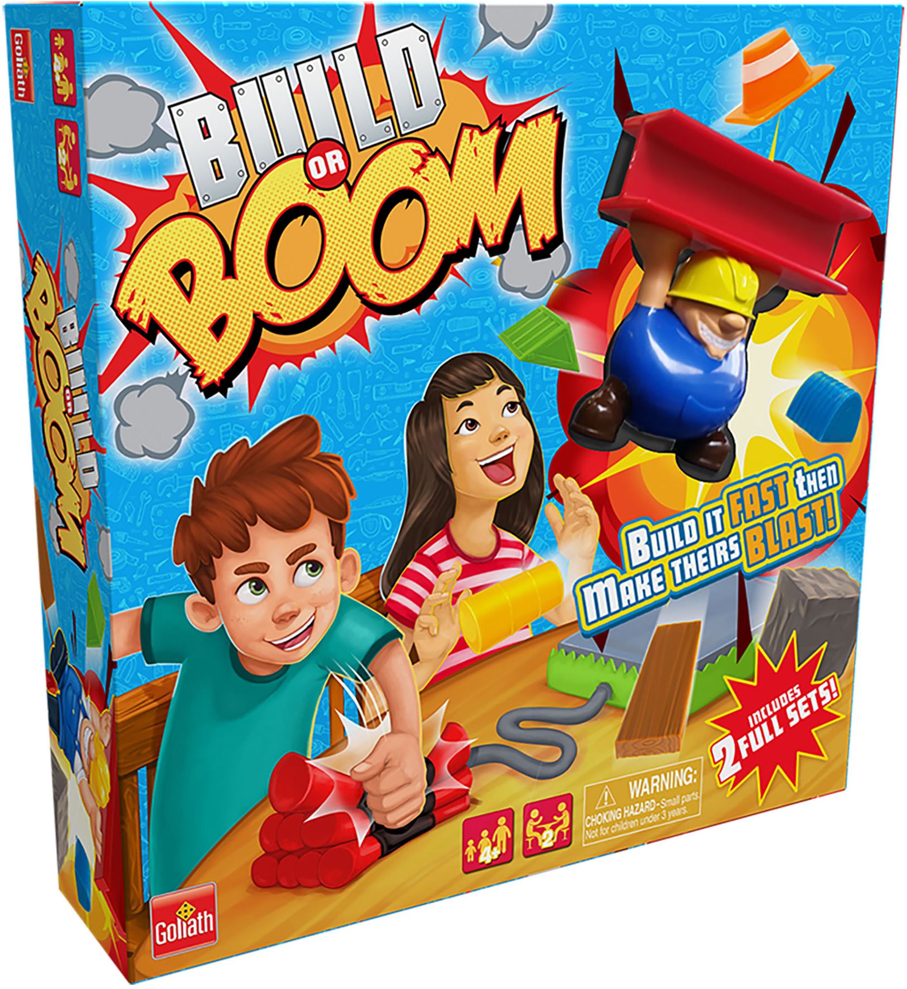 HOW TO PLAY: Race to be the first to stack your blocks exactly as shown on the construction card. When you finish yell BOOM! & hit the dynamite blast pad sending the other player's tower to the ground.