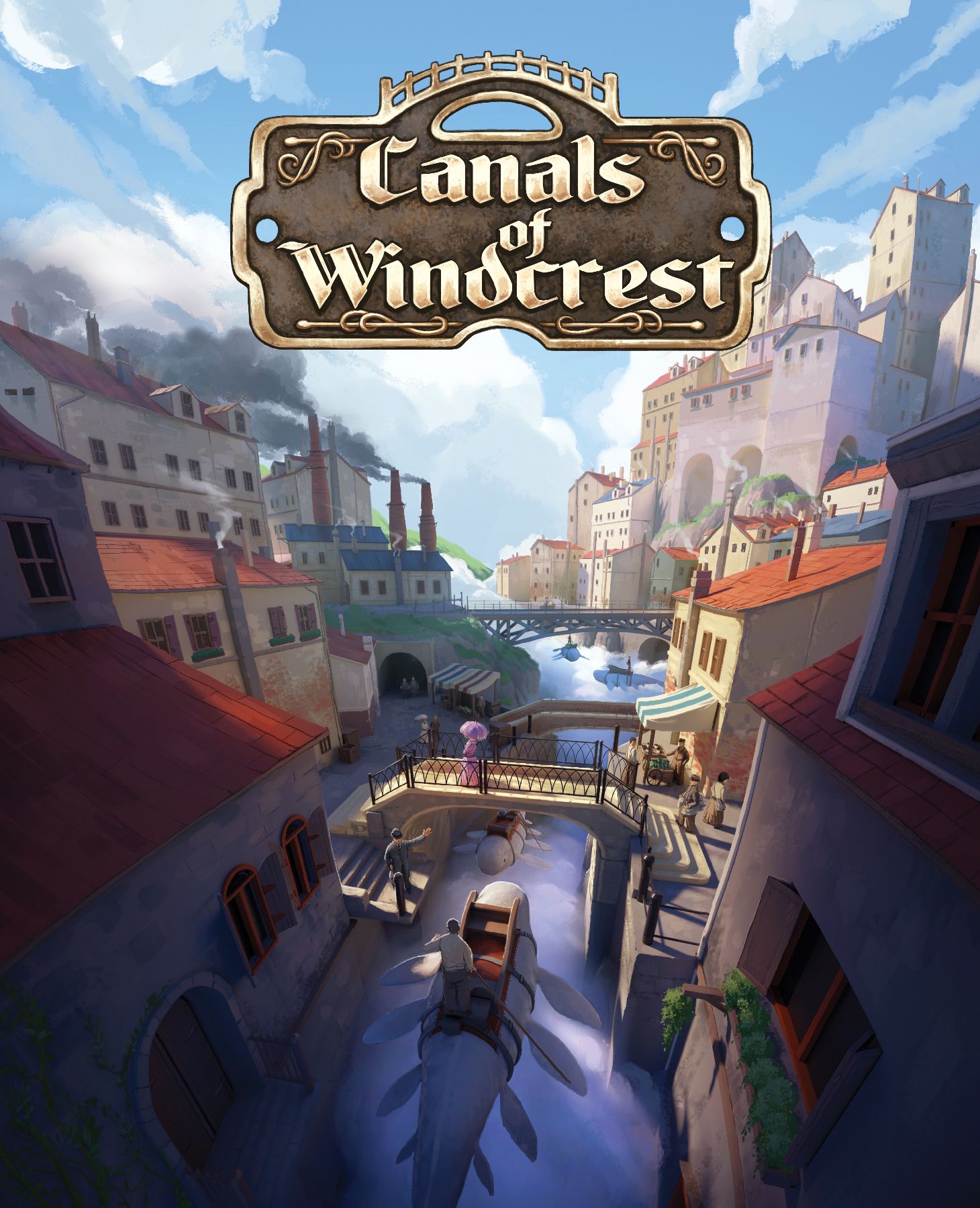 In Canals of Windcrest, players will draft location cards that will gain them resources and special actions. Resources are used to construct bridges and buildings, and also manufacture export goods. Navigate the canals with flying whale ferries to deliver exported goods while also transporting citizens and foremen to gain various bonuses. Players will also have investors to help them in various ways, including special powers and end game scoring bonuses.