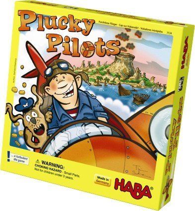 In Plucky Pilots, the game board shows a series of islands, with colored arrows connecting them; some islands feature canisters on them, and each island shows 1-13 coins, with the most distant islands being worth the most coins. On a turn, the player starts with the airplane in one corner and rolls the four-sided "dice sticks"; each dice stick has four colored arrows on its sides (red, yellow, green, blue), and after rolling she can move the plane along a colored arrow to an adjacent island as long as she rolled that color on a die. If she lands on an island with a canister, she must place one of her dice on it. She can then end her turn and score the number of coins shown on this island, or she can roll again; if she rolls again and can't move the plane, her turn ends and she scores nothing.