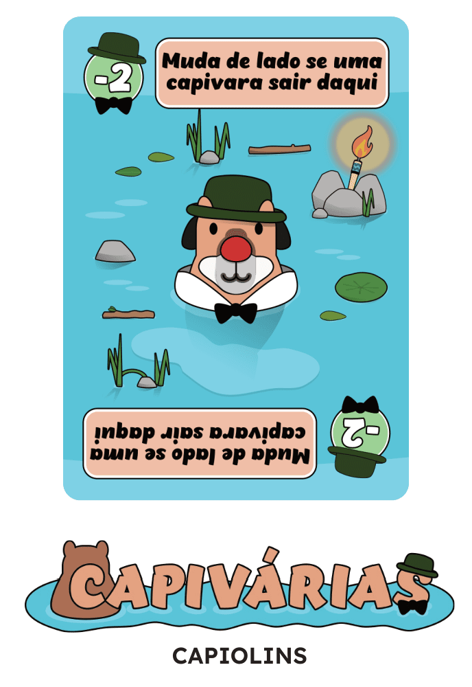 The Capiolins expansion adds a new type of capybara to the game: the Capiolins gives positive or negative points to the side of the river where it ends the round, but each push makes them change sides. This expansion is inspired by the game Malabares, which is also part of the Piquinim Collection.