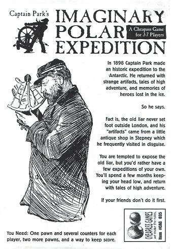 Descrizione: Captain Park's Imaginary Polar Expedition is a scavenger-hunt board game. The board is a highly un-representational map of London, showing all the best places to find Artifacts, Photographs, Anecdotes, and whatever else you need to prove you've been to Africa, Everest or wherever. Just to make your life interesting, Captain Park is wandering around looking for you.