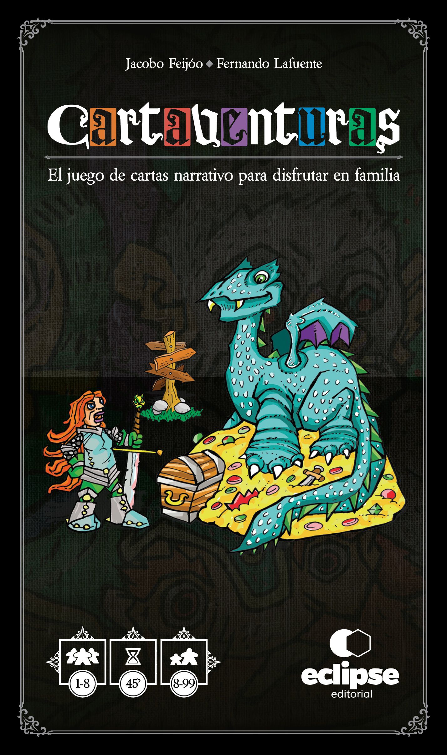 Cartaventuras es un juego de cartas narrativo en el que cada partida será la historia de tu gloria, o de la cena del Dragón si no lo vences. El mismo Dragón que atemoriza al Reino, si, ese, el del tesoro de incalculable valor.