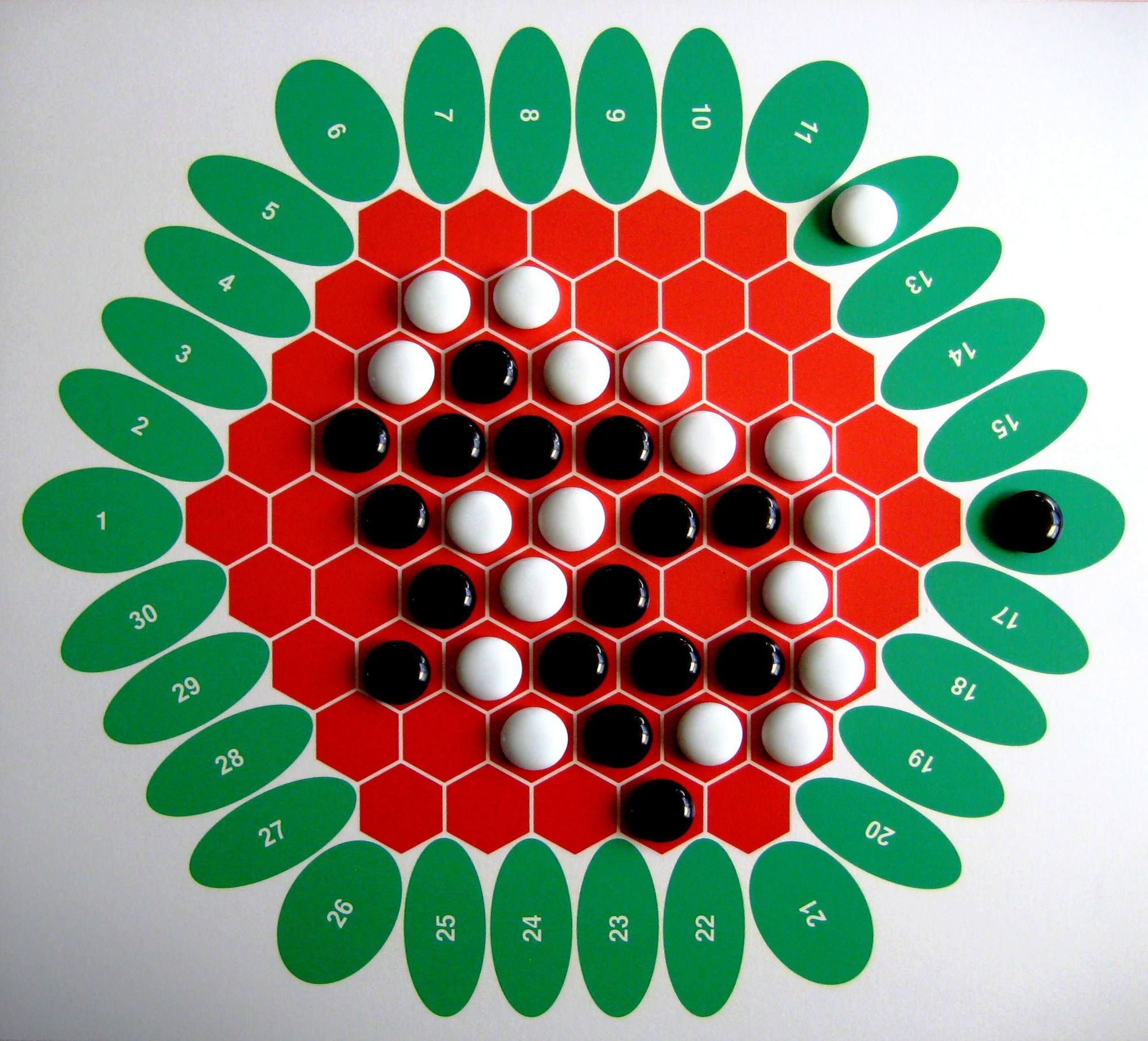 4. The game ends when the board is full. The player with the largest group wins. If the players’ largest groups are the same size, compare their second-largest groups, and so on, until you come to a pair which aren’t the same size. Whoever owns the larger of the two wins.