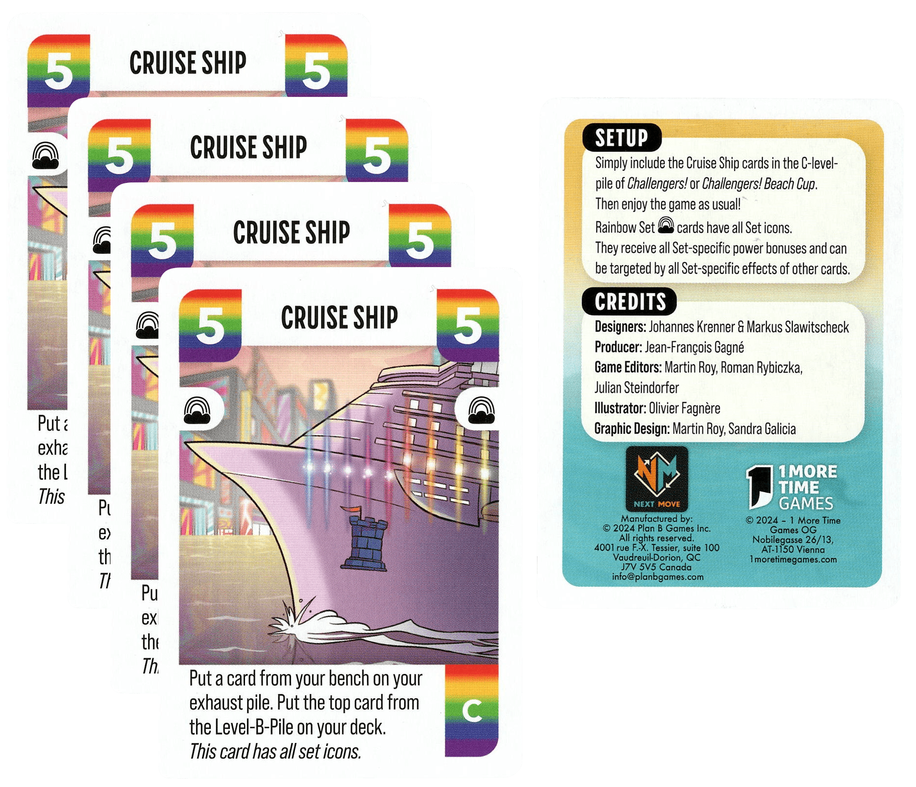 Setup: Simply include the Cruise Ship cards in the C-level-pile of Challengers! or Challengers! Beach Cup. Then enjoy the game as usual! Rainbow Set cards have all Set icons. They receive all Set-specific power bonuses and can be targeted by all Set-specific effects of other cards.
