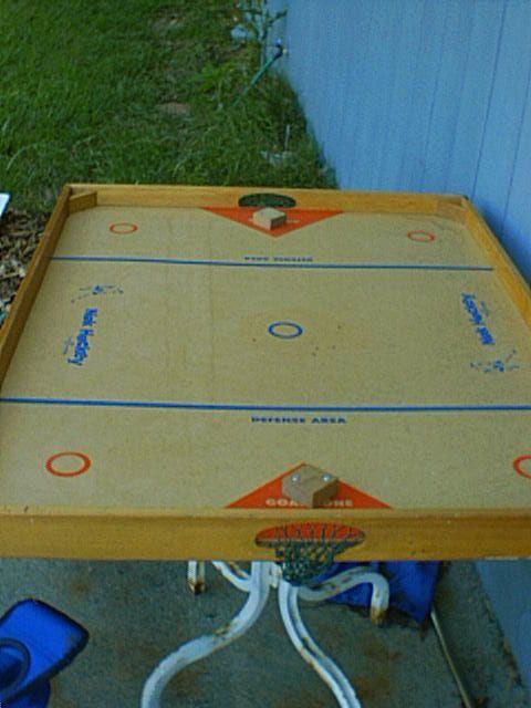 Descrizione: Action game played on a special table where you knock a puck through a goal using small hockey sticks.