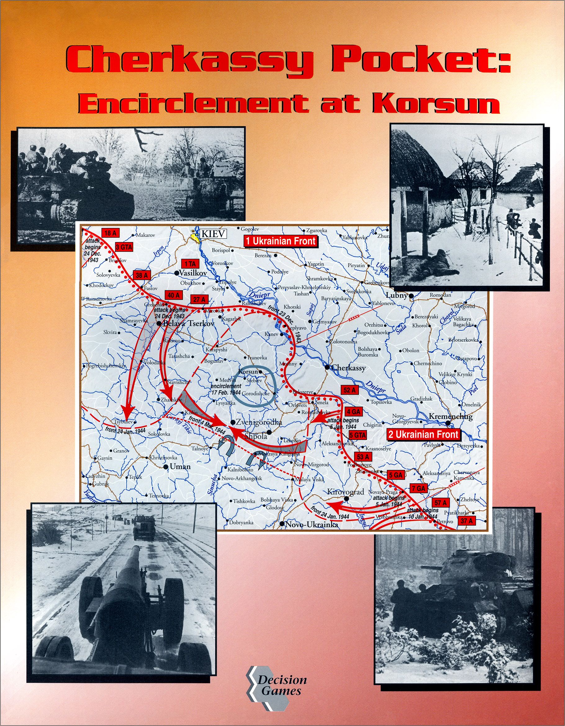 Cherkassy Pocket was designed by John Desch, and features a system similar to his wargames Wave of Terror and Berlin 45. Units are battalions and brigades, and the ground scale is 1.25 miles per hex. Each game turn represents 24 hours, and each player gets to move and perform combat twice in a turn. When it's time to activate friendly units, a player may choose to move first and then fight or vice versa. There are special rules to reflect the failure of Soviet tank maintenance, the use of the Korsun airfield as a supply source, Soviet difficulties in coordinating multi-formation attacks, and the ability for tank units to infiltrate enemy lines. Four scenarios allow you to play different portions of the battle, or to play the whole 23 turn campaign.