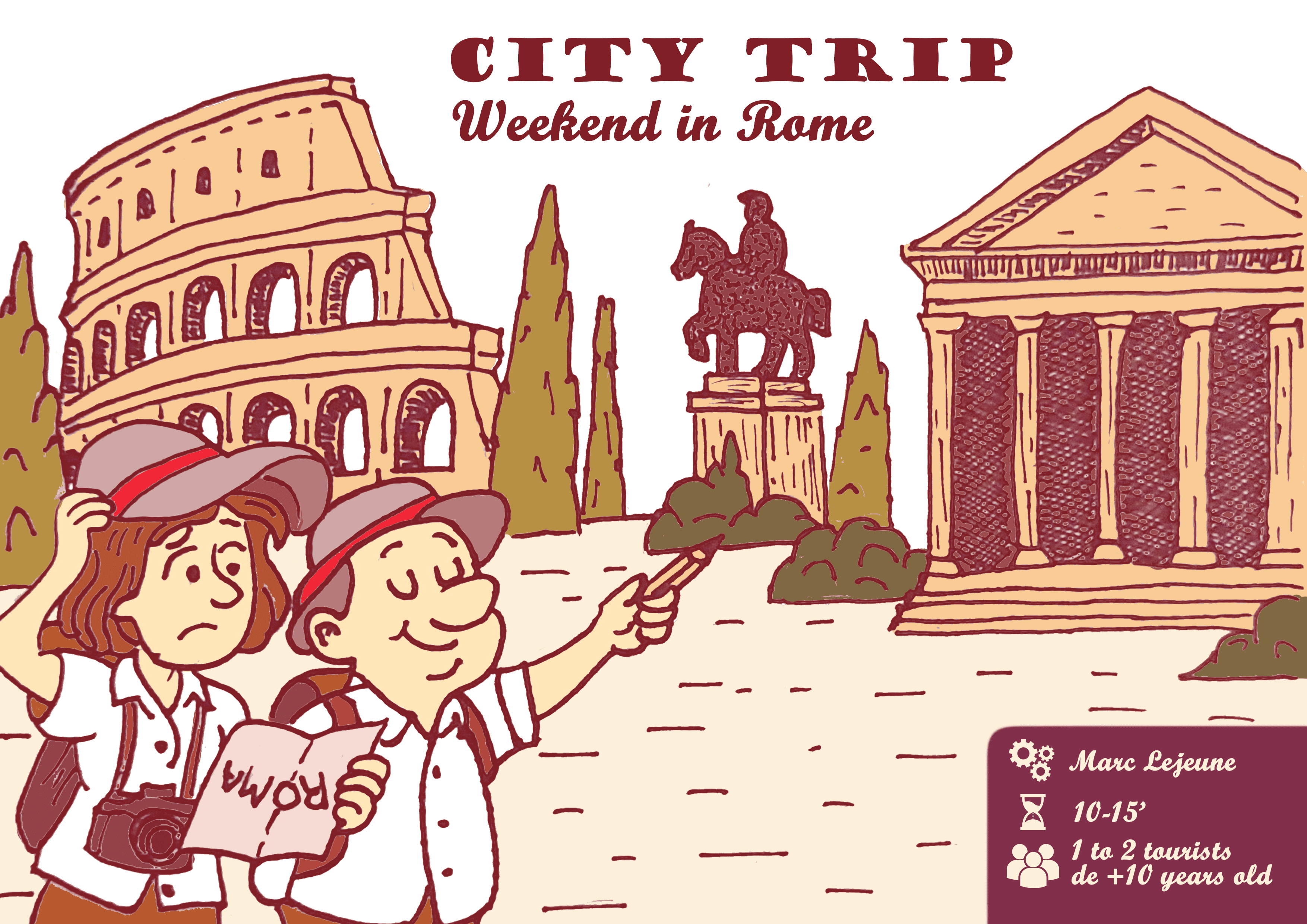 City Trip : Weekend à Rome est un jeu d’optimisation d’itinéraire entre les sites touristiques de Rome, à l’aide d’une vieille carte et d’un sens de l’orientation un peu rouillé… Visitez un maximum de monuments ! Mais attention à ne pas rater votre train pour le retour car l’horloge tourne et Pigboss (votre patron) vous empêchera de partir faire votre prochain city-trip si vous ne vous pointez pas lundi à 8h au bureau.