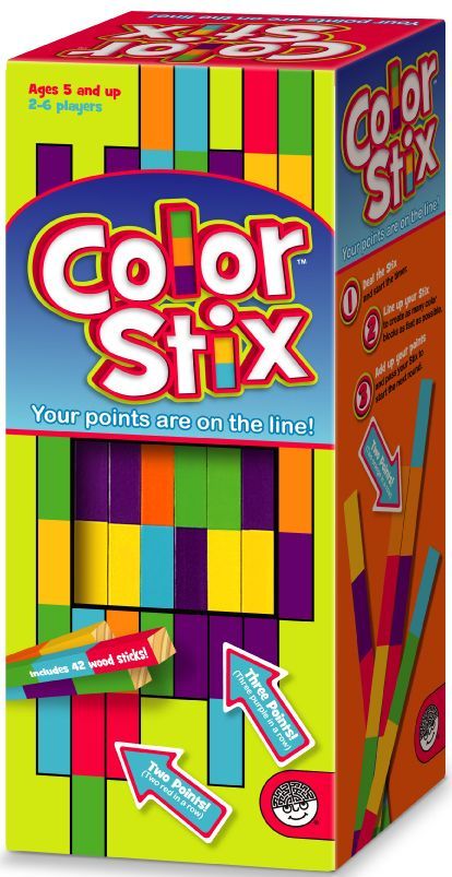 Color Stix includes 42 brightly-colored sticks – with seven colored rectangles on each stick – along with a 90-second timer. In the first round of the game, each player takes 7-10 sticks, holds them together in one hand, then drops them on the table once the timer starts. Players then arrange and rearrange the sticks to place similarly colored rectangles adjacent to one another and form large blocks of a single color.