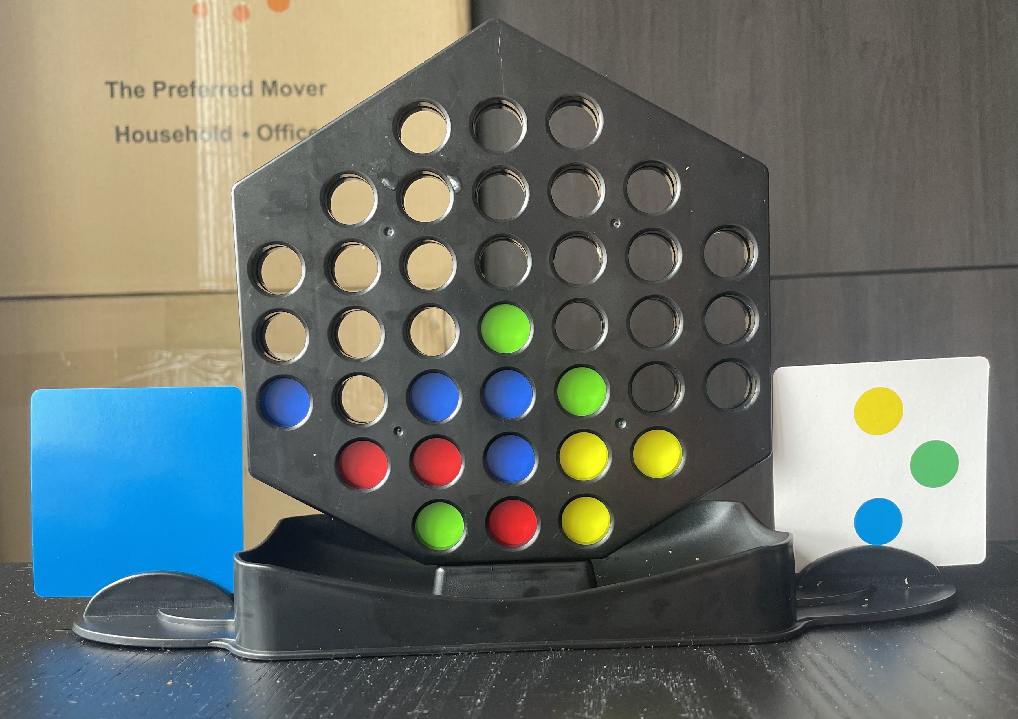 Descrizione: Draw a card, then take turns to select a coloured token and place it in a octagon-shaped grid. When tokens in the grid match the pattern on your card, declare the card as complete. Complete 5 cards to win.