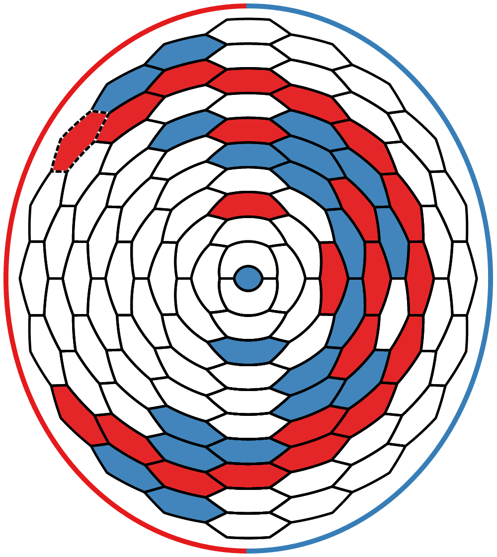Descrizione: A connection game played on the curved surface of a cone. The goal is to create a closed loop from the player's edge to the centre, or to connect a path to the centre. The game can be played on a projection, which is isomorphic to the usual Hex rhombus with some cells overlapping or removed.