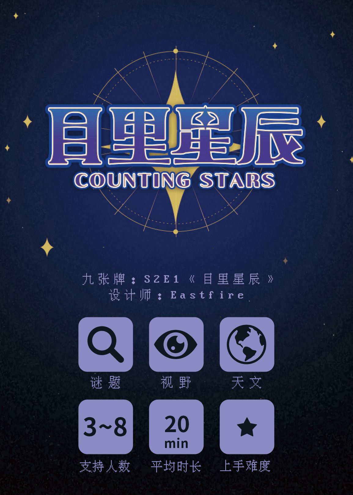 Counting Stars (目里星辰) is a deduction game centered on asymmetric information and perspective. Players each hold cards representing celestial bodies, seeing only one side while others see the opposite. Through careful questioning and logical reasoning, players attempt to reconstruct hidden information.