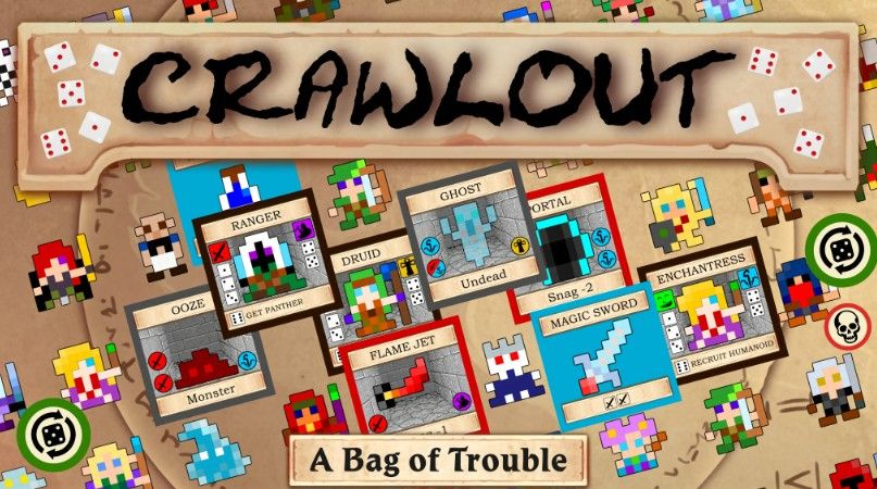 Crawlout: A A Bag of Trouble uses a bag-draw system where you pull tokens or cards representing rooms, enemies, items, and events. Each draw progresses your dungeon crawl, with branching paths and unexpected encounters emerging organically from the randomized sequence. Combat and exploration are resolved with minimal bookkeeping—often just tracking stats with dice or a small player sheet.