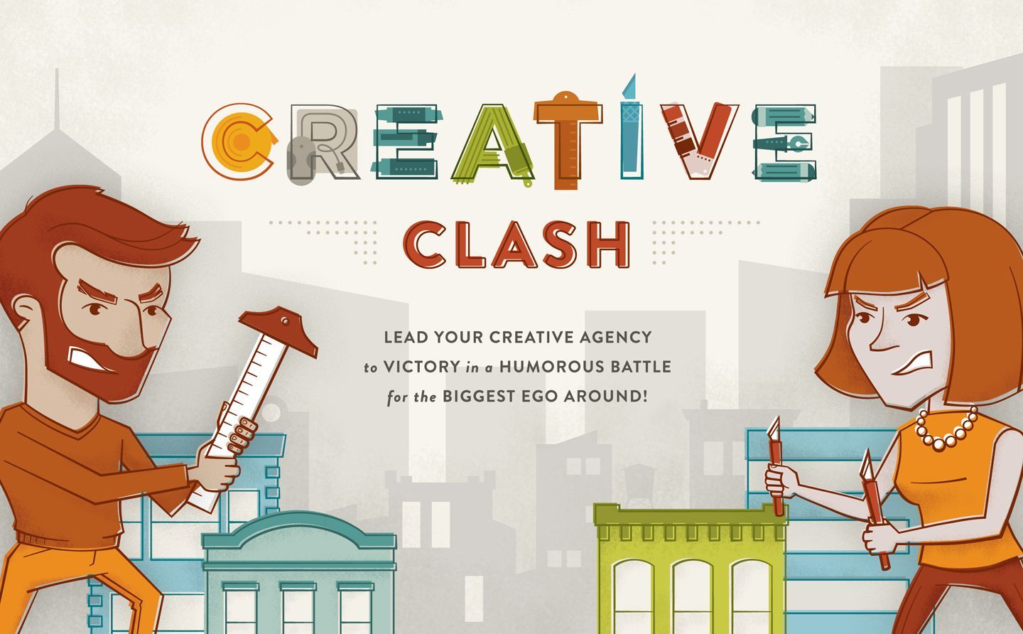 Descrizione: The graphic design and advertising industry is a fast-paced and competitive place, as any creative or developer can tell you. Creative Clash is a humorous card game that pokes fun at the industry. Players take on the role of owner of their own creative agency. They hire employees, compete to complete projects and buy lots of cool stuff in order to reach their ego goal. The first player to reach their ego goal is the winner. Players have plenty of opportunity to sabotage each other with an assortment of event cards.