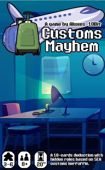 Descrizione: Holiday's over! As you stepped on your home country's soil, you have been selected along with several other passenger for a random security check! Customs Mayhem is an 18-cards bluffing and deduction game fit for 3-6 players, where each player holds a hidden Role Cards that determines their winning condition aside from being the last man left standing. Players start with 2 Baggage cards containing the quantity of restricted items they bring along, and the First player gets to decide which game mode they going to play in this round; Inquire or Declare. In Inquire, the first player choose another player to be inquired, where that player must tell two-truths-and-one-lie that the first player must deduce. In Declare, each player put 1 Baggage card to the center face-down and guess the minimum of total quantity of single item. The next player must increase the declaration by 1-2 increments until someone decides to accuse the last player's statement and reveal all cards in the center. The turn ends when someone gets caught lying and be Detained. The rest of the player gets to play and decides the next turn game mode until someone manages to fulfill the winning conditions of their Role cards, where the game may ends with more than one player winning the game. —description from the designer