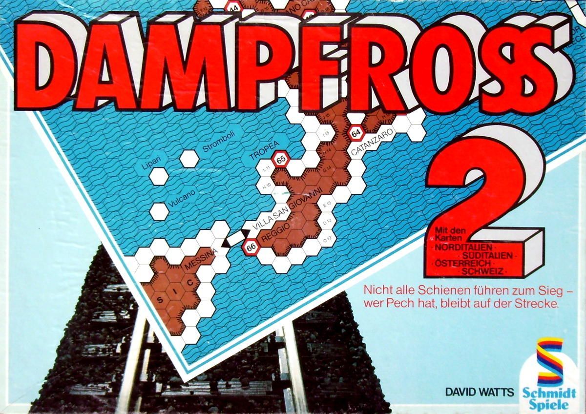 Descrizione: Dampfross 2 is a standalone game using the same rules as Dampfross, but with 4 new maps: Southern Italy, Northern Italy, Switzerland and Austria. Dampfross 2 also provides a Laubfroschvariante; a 'leapfrog variant'. Players can now jump up to 3 spaces after their network has been attached to an opposing network. Each player is allowed 8 jumps per game and must pay for them accordingly.