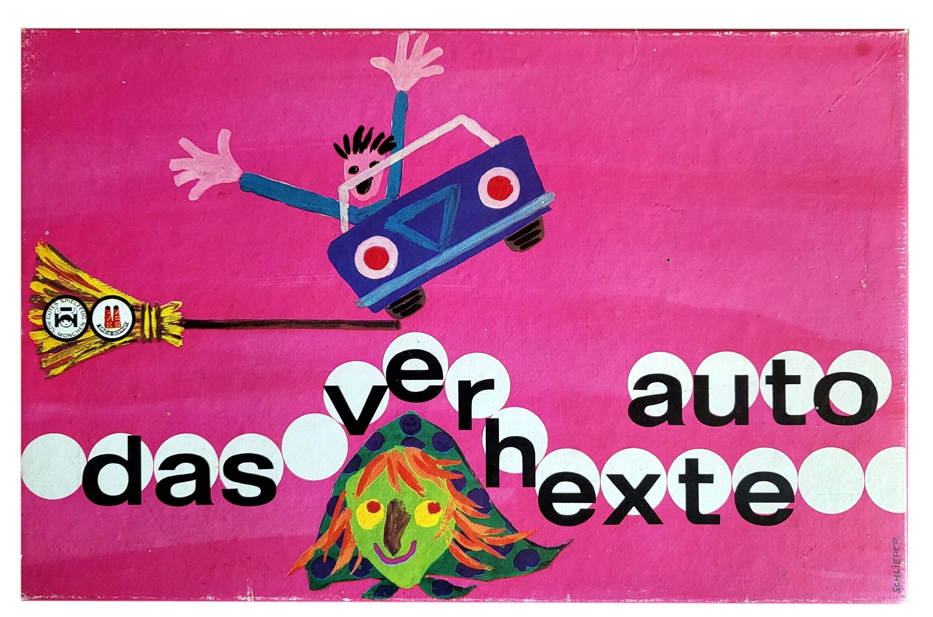 Descrizione: The starting position and final destination for all players is the zebra crossing, which a boy is walking across. Players each choose a car and take turns rolling the dice; the player with the highest number starts. They move their car according to the number rolled, followed by the other players in a clockwise direction. If a player stops on a blue space, they must get into a bewitched car. To do this, they take the top car card from the stack. As long as the player is in the bewitched car, they only move on the blue spaces and therefore advance very quickly. However, if they cannot get out in time before the finish, they drive past the finish and must start a new round. The car card has a number on it; when it's their turn and they roll this number, they may get out again. They then place their car on the white space behind the last blue space counted. They place the car card back at the bottom of the stack. The winner is the player who reaches the zebra crossing first. The players can agree whether the square must be reached exactly, or whether it is sufficient if a player moves across the zebra crossing while moving on the white squares. —user summary