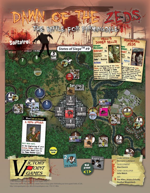 Like a deathly hand from the grave comes Dawn of the Zeds, a States of Siege solitaire game of horror and survival from designer Hermann Luttmann .