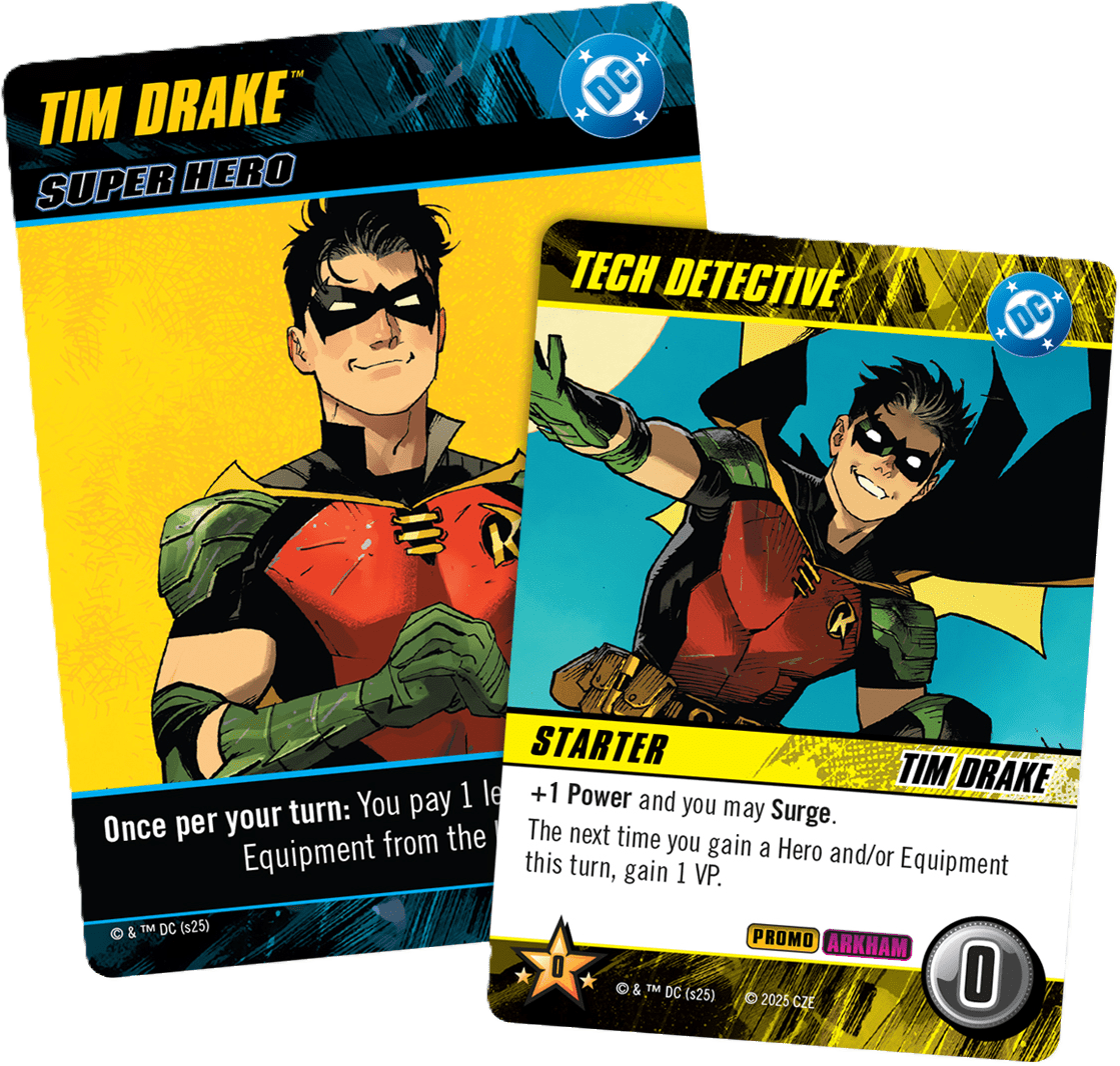 Descrizione: DC Deck-Building Game: Tim Drake/Tech Detective is a set of two cards first available at Gen Con 2025 that could be obtained by participating in a DC DBG event.