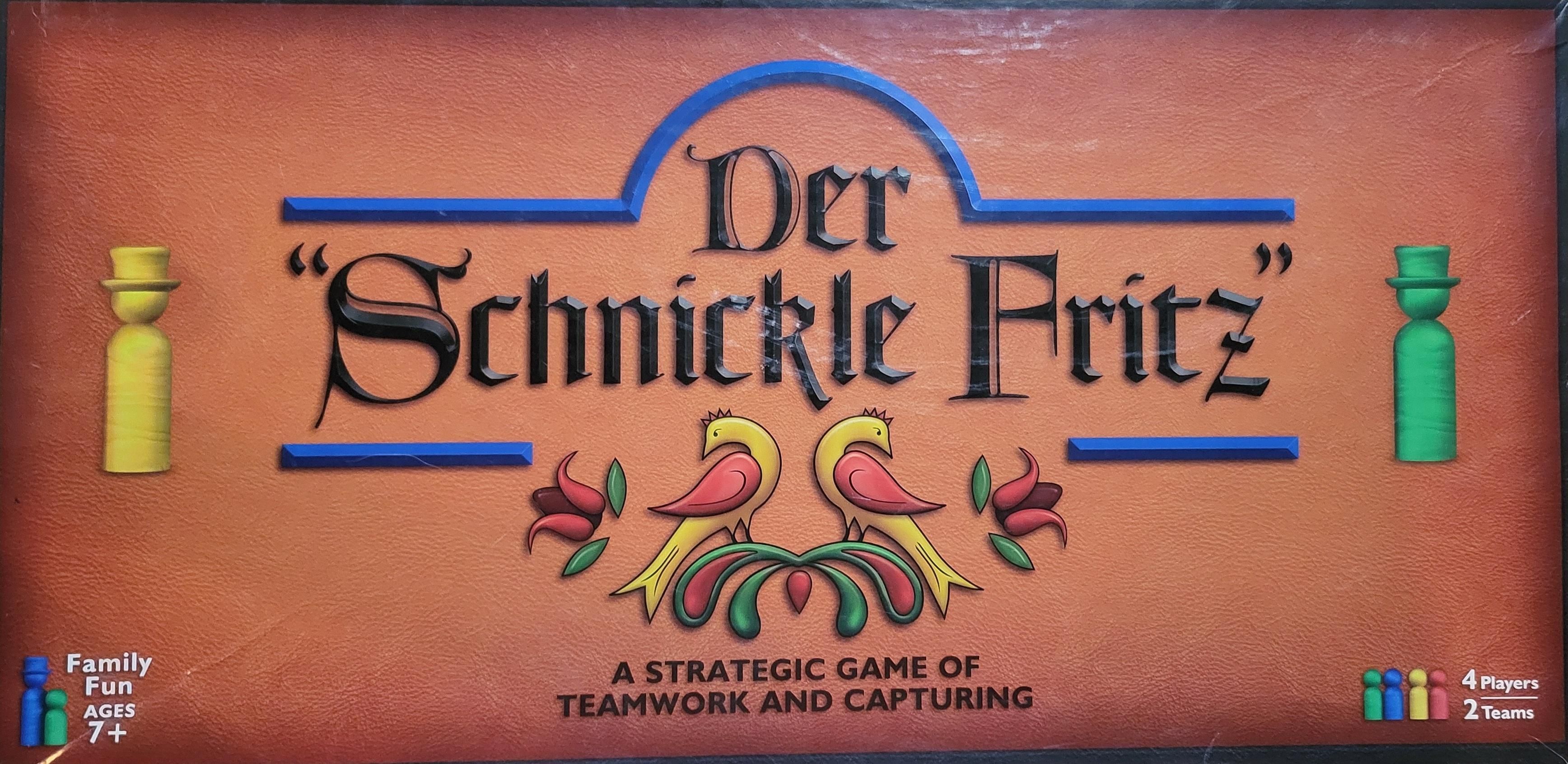 Played on a board similar to Checkers and with similar movements. board is 11x11 with the 4x4 corners missing. So a 2x7 at each side is the "home" Movement is diagonally on the black squares. Boys may only move forward. Teammates sit opposite each other. You capture your opponents by jumping over them. You can also jump over your teammates pieces but they are not captured. A boy becomes Der "Schnickle Frits" when he reaches the farthest row of black spaces in his teammates home. Each player may only have one Der "Schnickle Fritz" in play at a time. Der Schnickle Fritz" can move forward and backword.