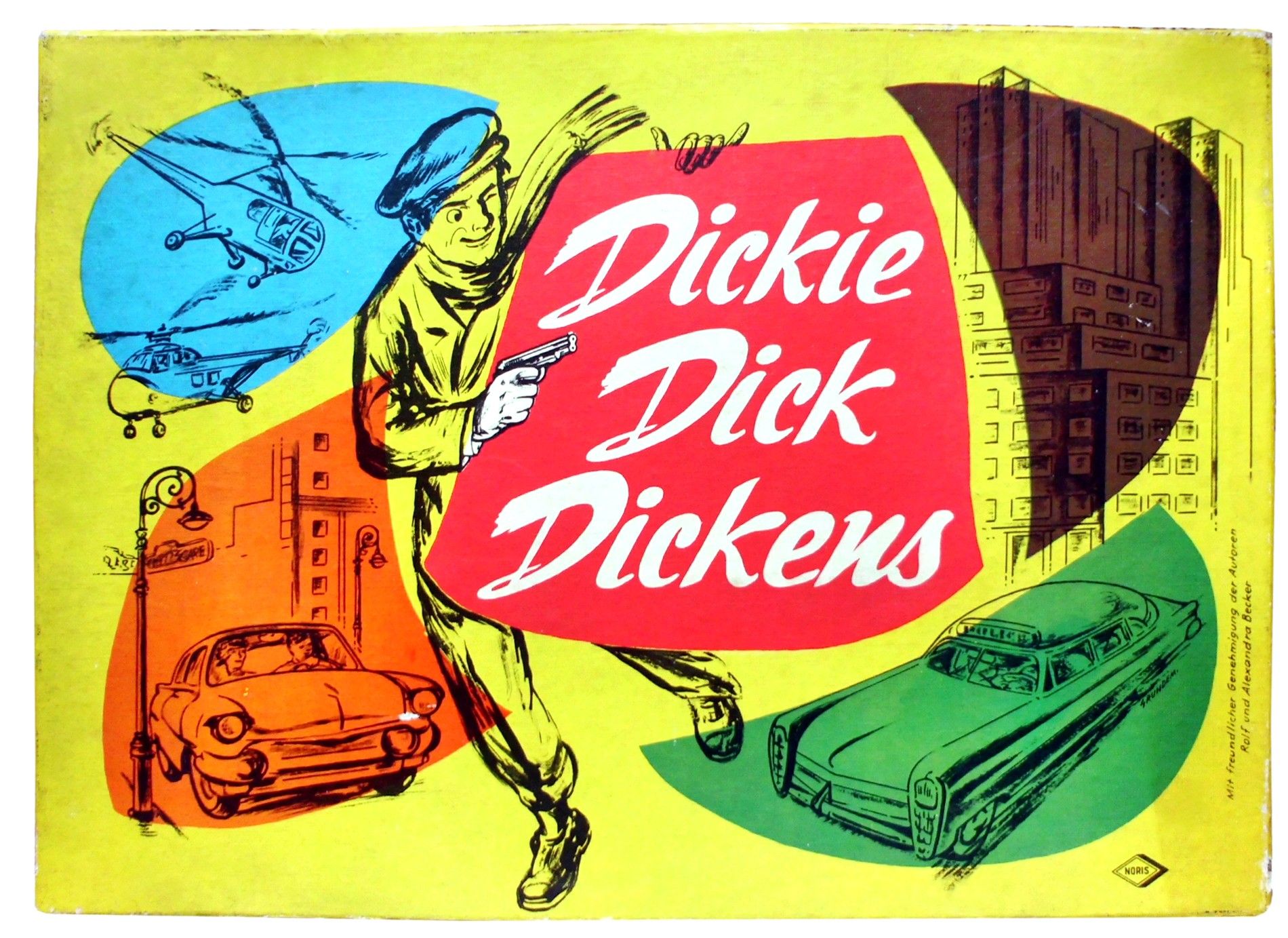 Descrizione: One player playes Dickie Dick Dickens (DDD) and up to four players are his pursuers. DDD has to get from one D-Space to the other. Movement is determined by a die. The pursuers start at the blue V-spaces and try to catch DDD by landing on the space he occupies. If DDD lands on a space that is occupied by a pursuer, the pursuer goes to prison for the rest of the game. If a 6 is rolled the player may not move but draws a card and has to follow the instructions printed on it. DDD may not move through the blue areas, whereas the pursuers are forbidden to move through the orange areas.
