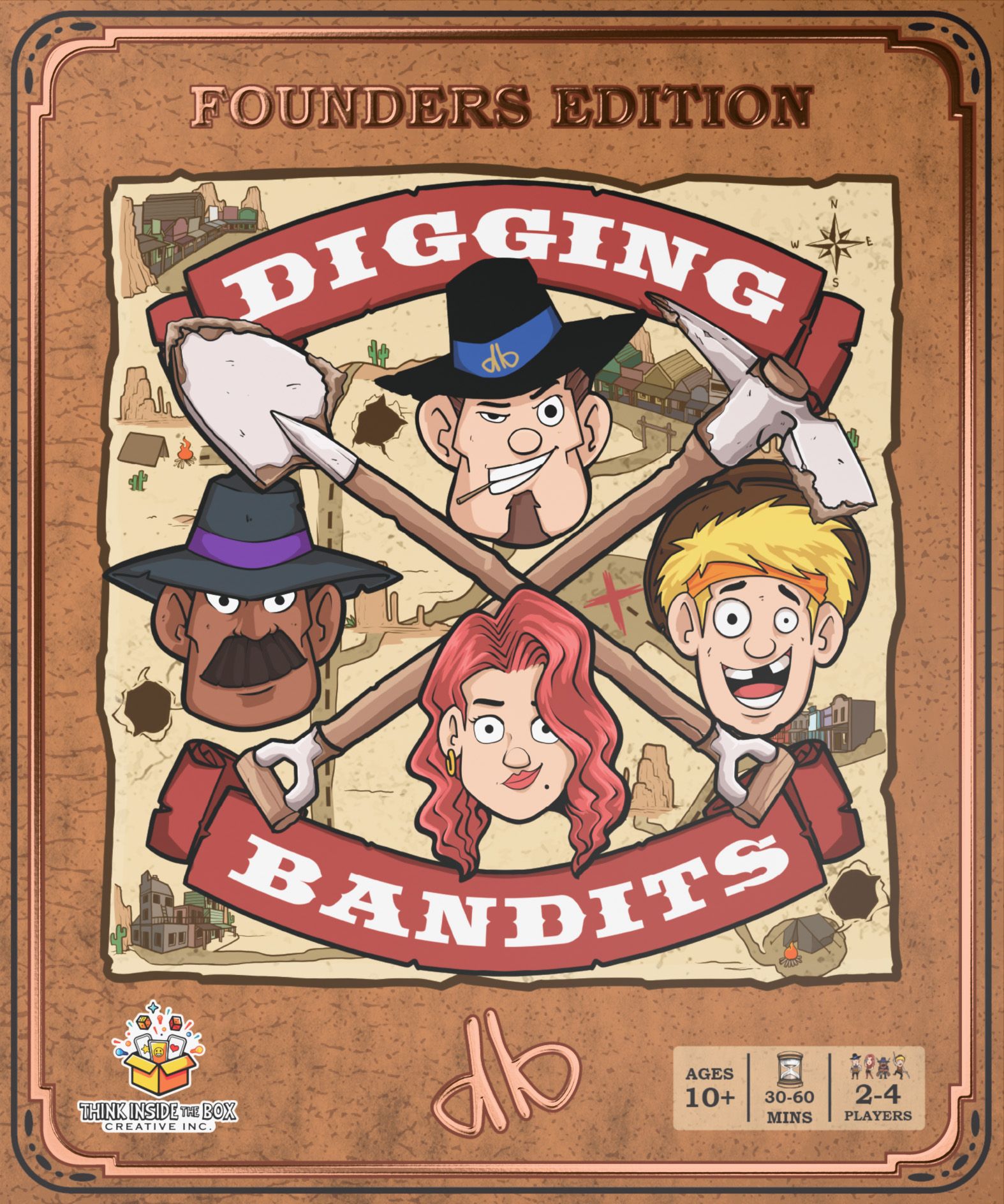 Descrizione: Digging Bandits is a fast-paced strategy game set in the Wild West, where players take on the roles of notorious bandits racing to unearth hidden treasure. Set against the backdrop of rugged desert terrain, players compete to find buried gold or eliminate their rivals using WANTED cards. To win, a player must either locate the gold and cash it in at one of the four towns or be the last bandit standing by taking out the competition.