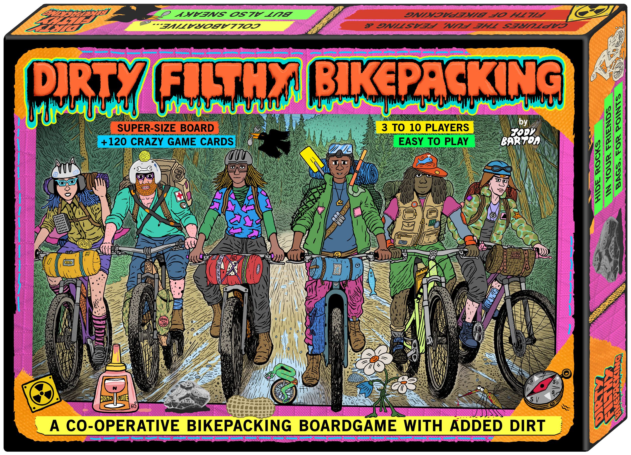 Descrizione: Get dirty, silly & nowhere fast in this intuitive, crazy game that perfectly captures the skids, scents and sidequests of bikepacking. A roll and move cycle camping board game with a co-operative and comedic flavour. To succeed you must help each other solve problems but players can also play practical jokes on one another.